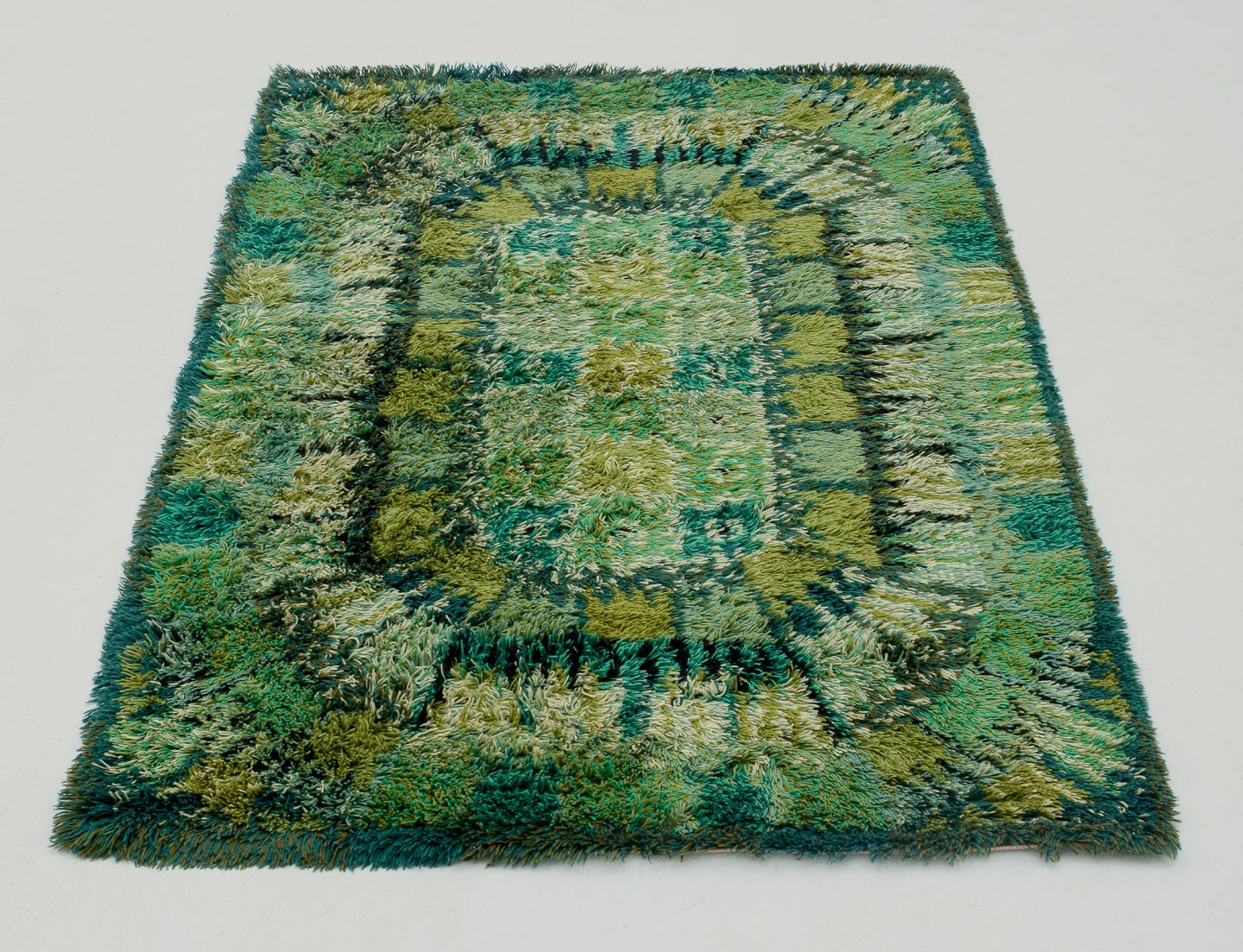 Marianne Richter for Öster Gyllen. Rya carpet in pure wool. Geometric pattern. Green tones. 1970s. Perfect condition. Dimensions: 193 cm x 141 cm.
