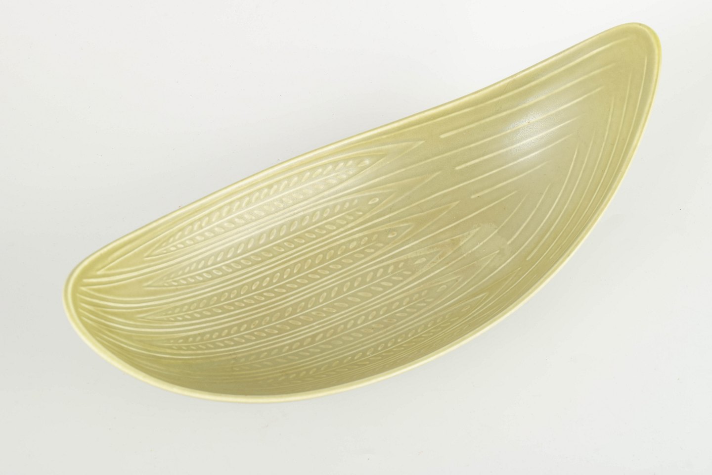 Organically shaped stoneware bowl with incised interior pattern and elegant curved, boat-like silhouette.