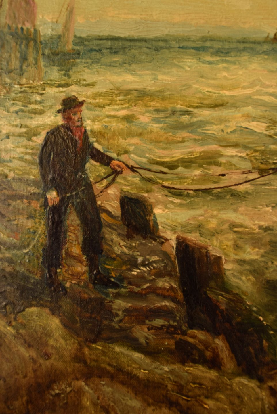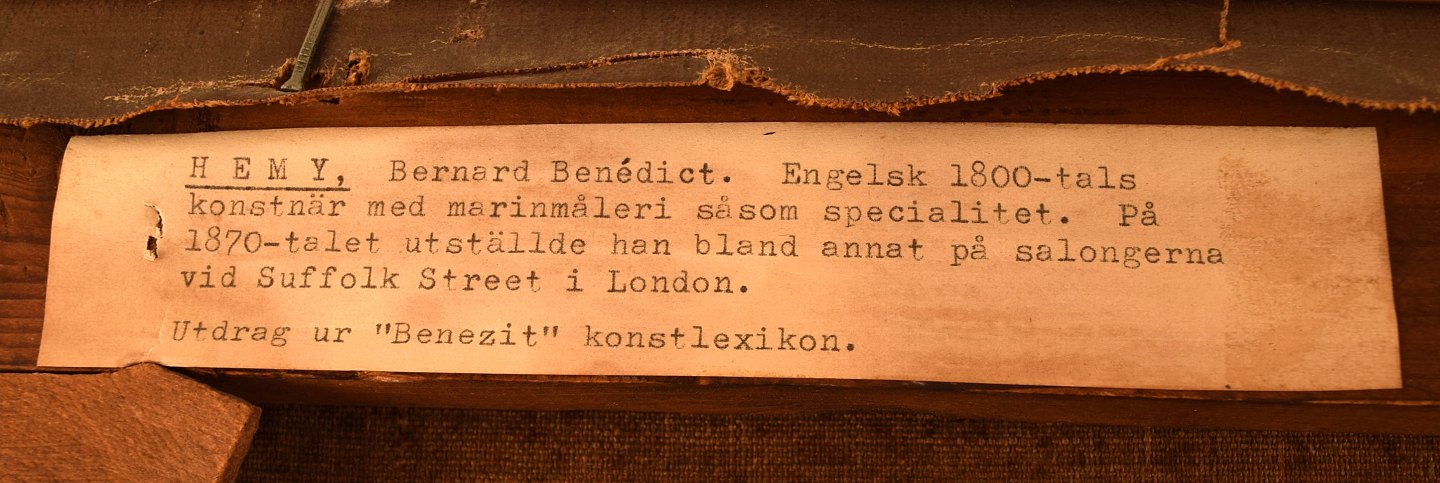 Bernard Benedict Hemy (1845-1913), britisk marinemaler. Olie på lærred. Fiskere går i land. 1880'erne. I flot stand. Signeret. Lærredet måler: 75 x 49 cm. Rammen måler: 8,5 cm.