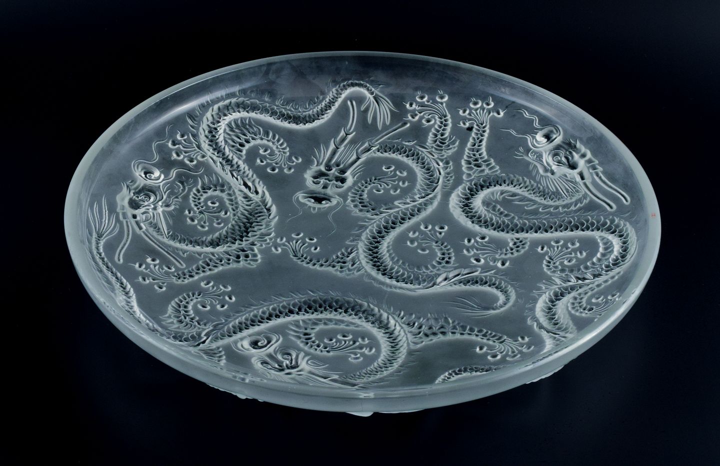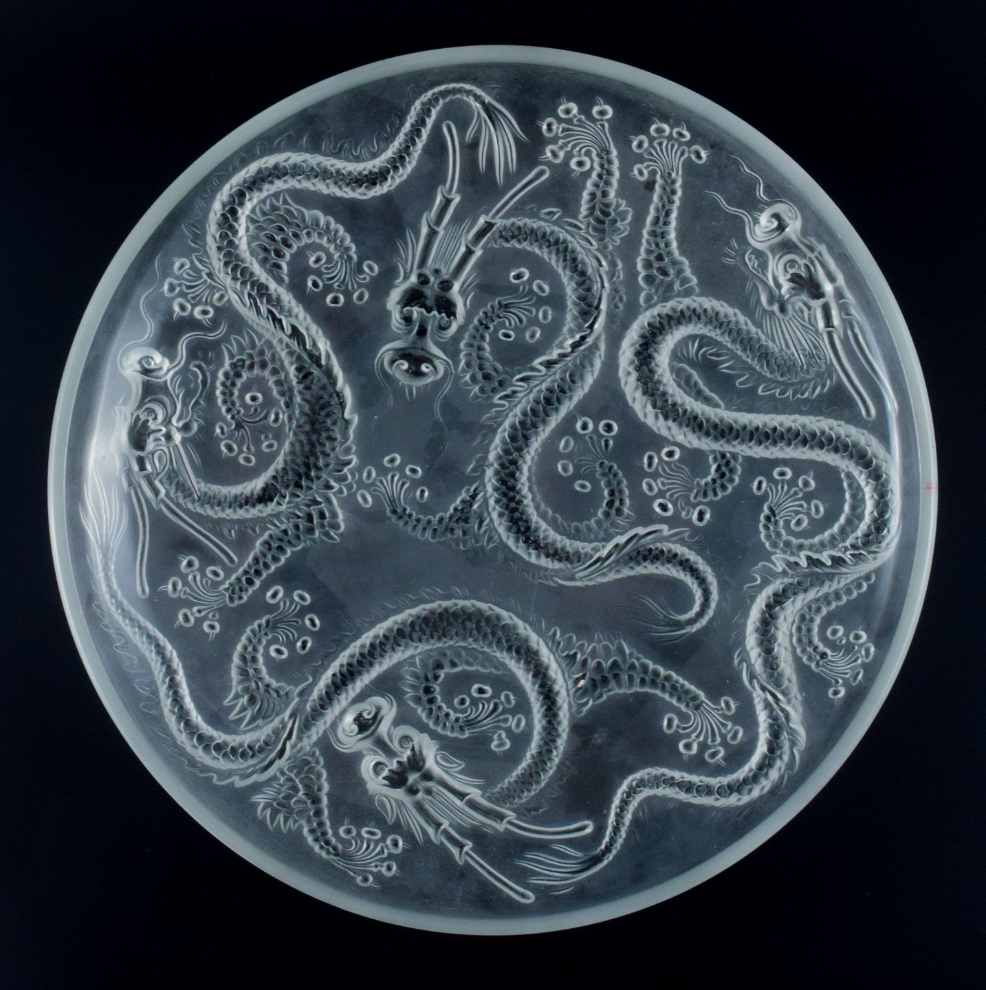Josef Inwald, stor kunstglasskål i Barolac glas, designet med drager i orientalsk stil. Ca. 1940’erne. I perfekt stand. Mål: D 35,5 x H 5,0 cm.