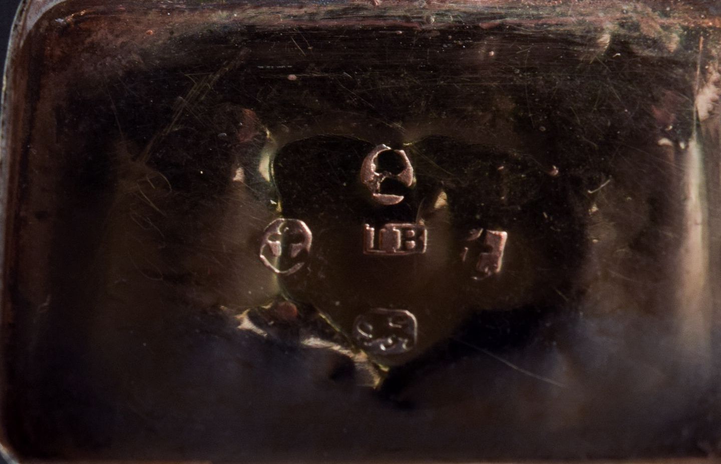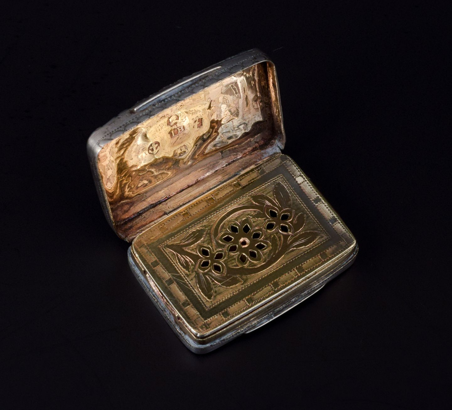 Antik miniature pilleæske i sølv, indvendigt forgyldt. Dekoreret med rose på låg. Birmingham 1817-1818. I flot stand. Stemplet. Mål: L 3,5 x D 2,5 cm.