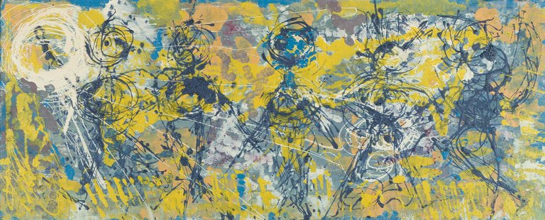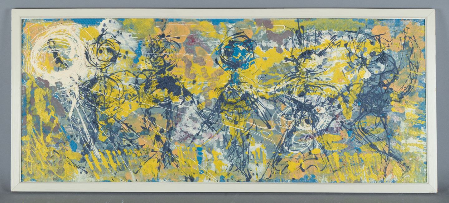 Skandinavisk kunstner, olie på plade, abstrakt komposition med farverig palette.