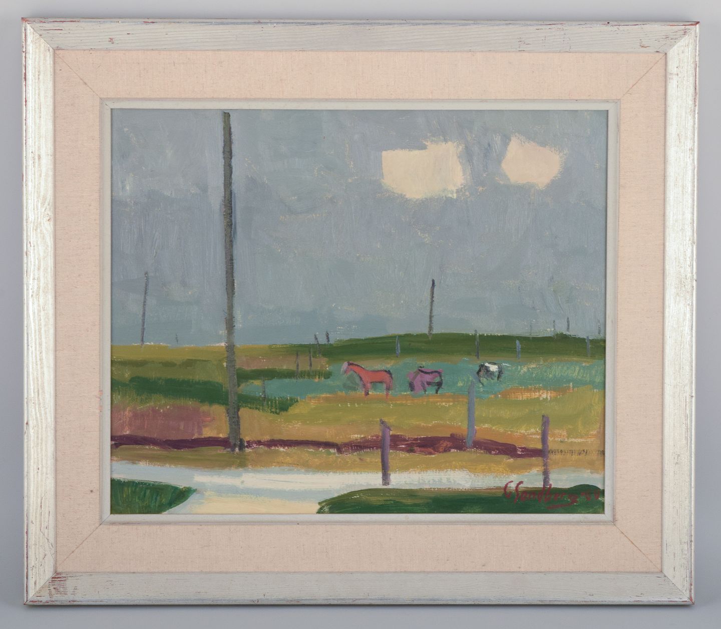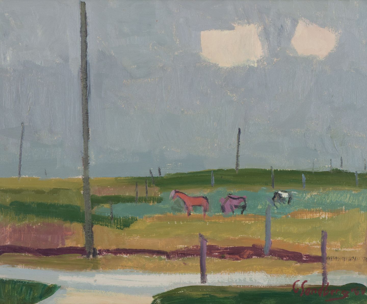 Modernist landscape with horses in a meadow.