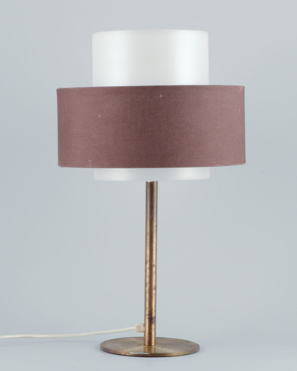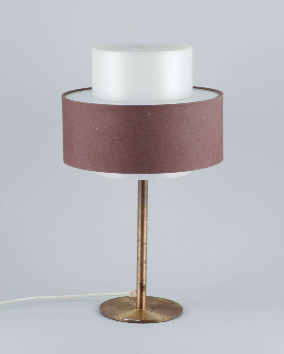 Luxus, Sweden. Large table lamp in brass with a shade in plastic and brown fabric.