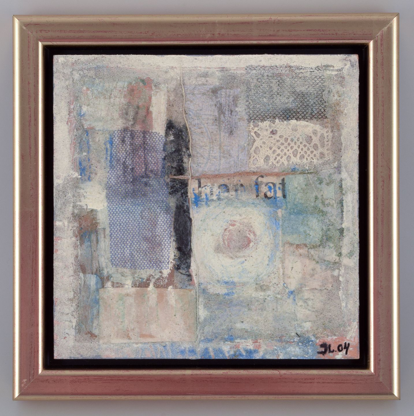 Jette Lindberg, dansk kunstner. Mixed media på plade. Abstrakt komposition.