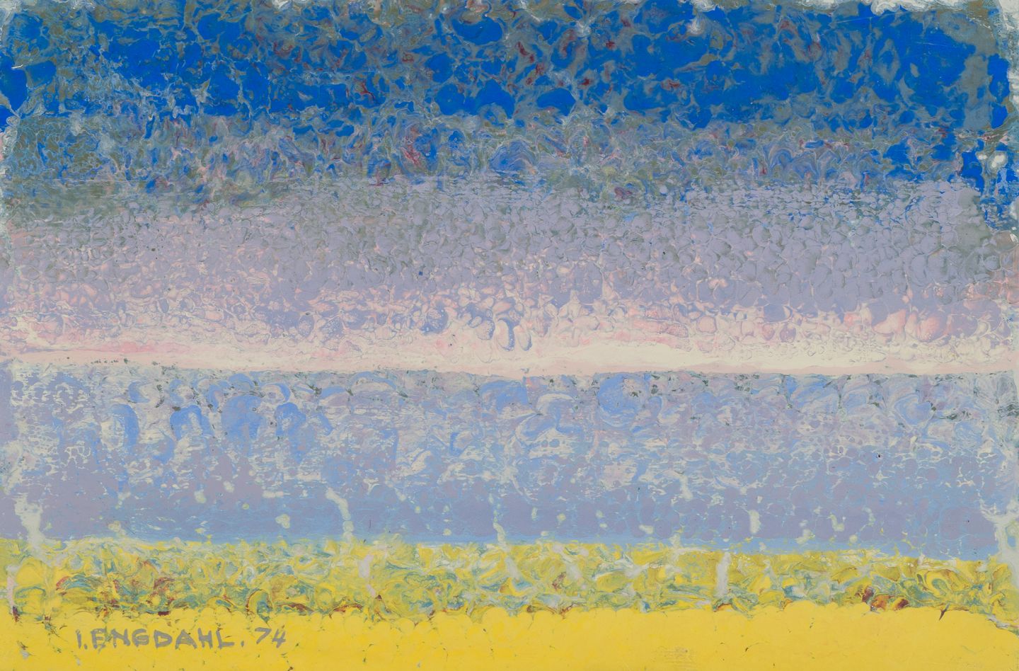 Ingvar Dahl, svensk kunstner. Olie på plade. Abstrakt landskab. Blank overflade. Titel: ”Mjukt Hav”. Signeret og dateret ’74. Perfekt stand. Mål: 23,5 cm. x 16,0 cm.