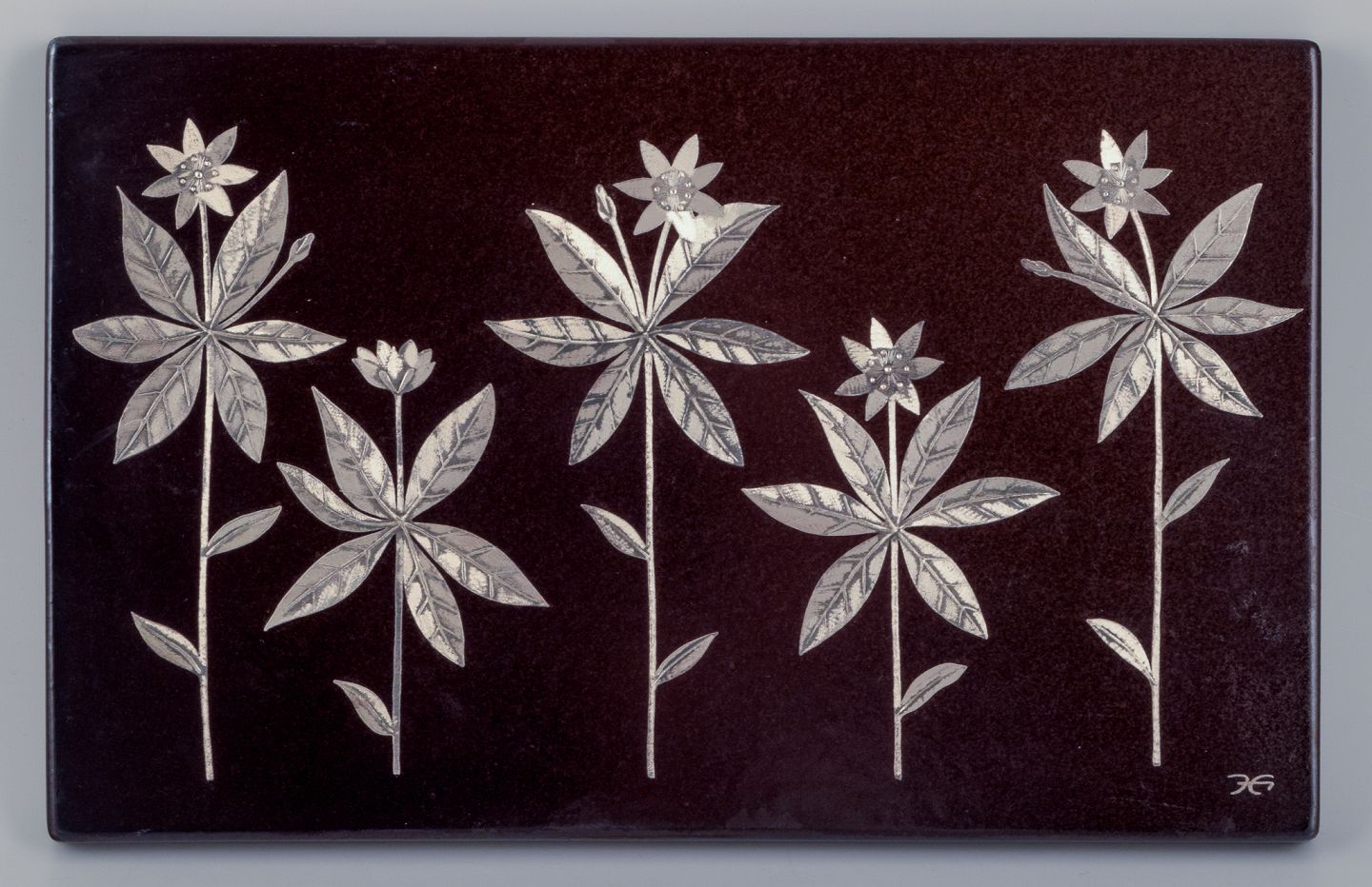 Heinz Erret (1920-2003) for Gustavsberg. "Skogsstjärna" wall plaque in glazed ceramic with silver inlay in the form of flowers.