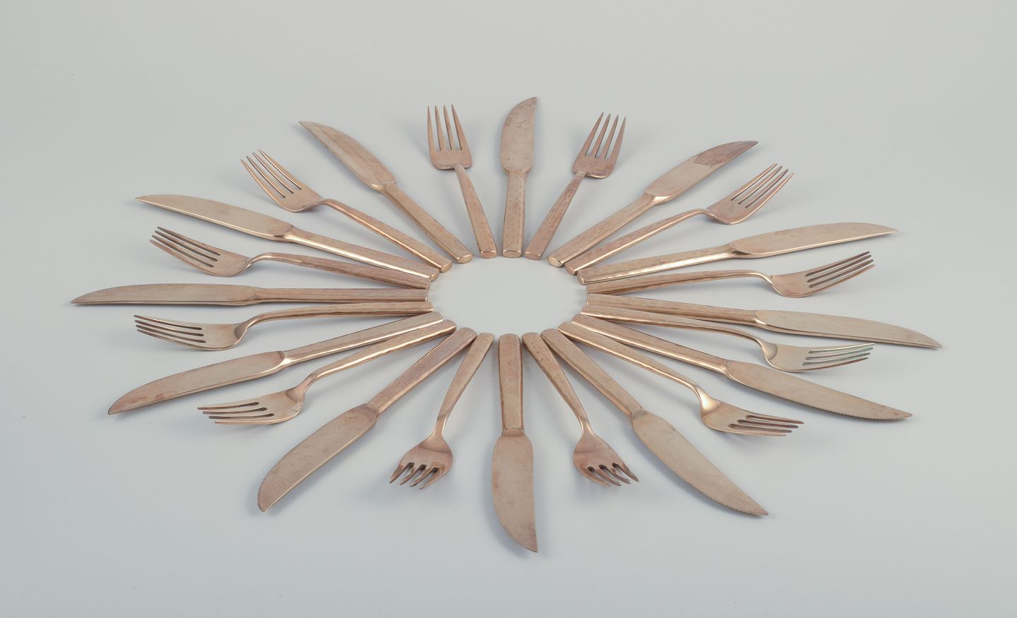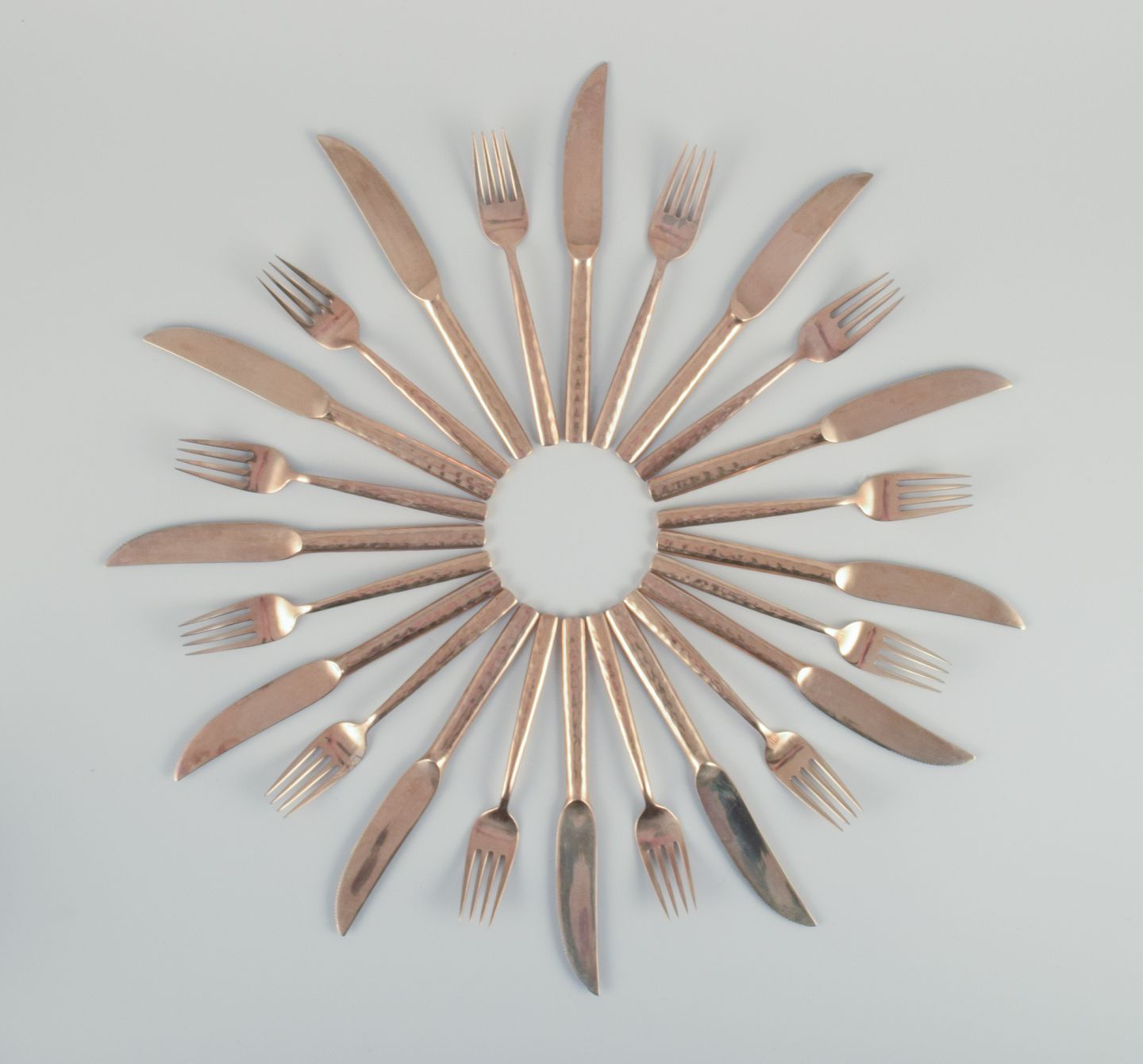 Scandinavian designer. Twelve-person dinner service consisting of twelve dinner knives and twelve dinner forks in handcrafted hammered brass. High-quality craftsmanship.