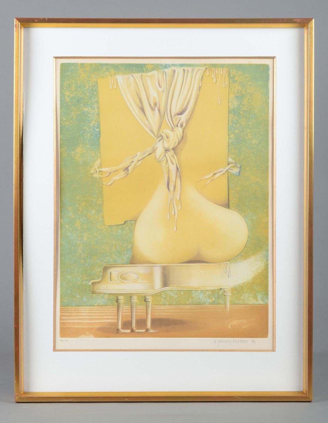 En karakteristisk surrealistisk komposition af Bert-Johnny Nilsson, hvor en forvrænget figurform smelter sammen med et klassisk klaver. Det organiske, næsten drømmelignende motiv understøttes af en sart farveholdning i gule og grønne toner. Nilssons værker fra 1970’erne er præget af humor, fantasi og en tydelig inspiration fra surrealismens billedsprog.