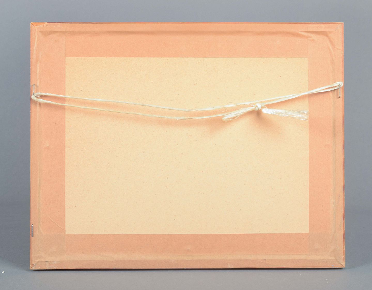 En koloristisk abstraktion af Helge Christiansen, hvor dybe blå og violette toner skaber en geometrisk opdeling af billedfladen. Det centrale felt i lysere blå åbner kompositionen og giver værket en næsten arkitektonisk karakter. Christiansens akvarel afspejler den danske efterkrigsmodernismes interesse for farveflader og rumlige relationer.