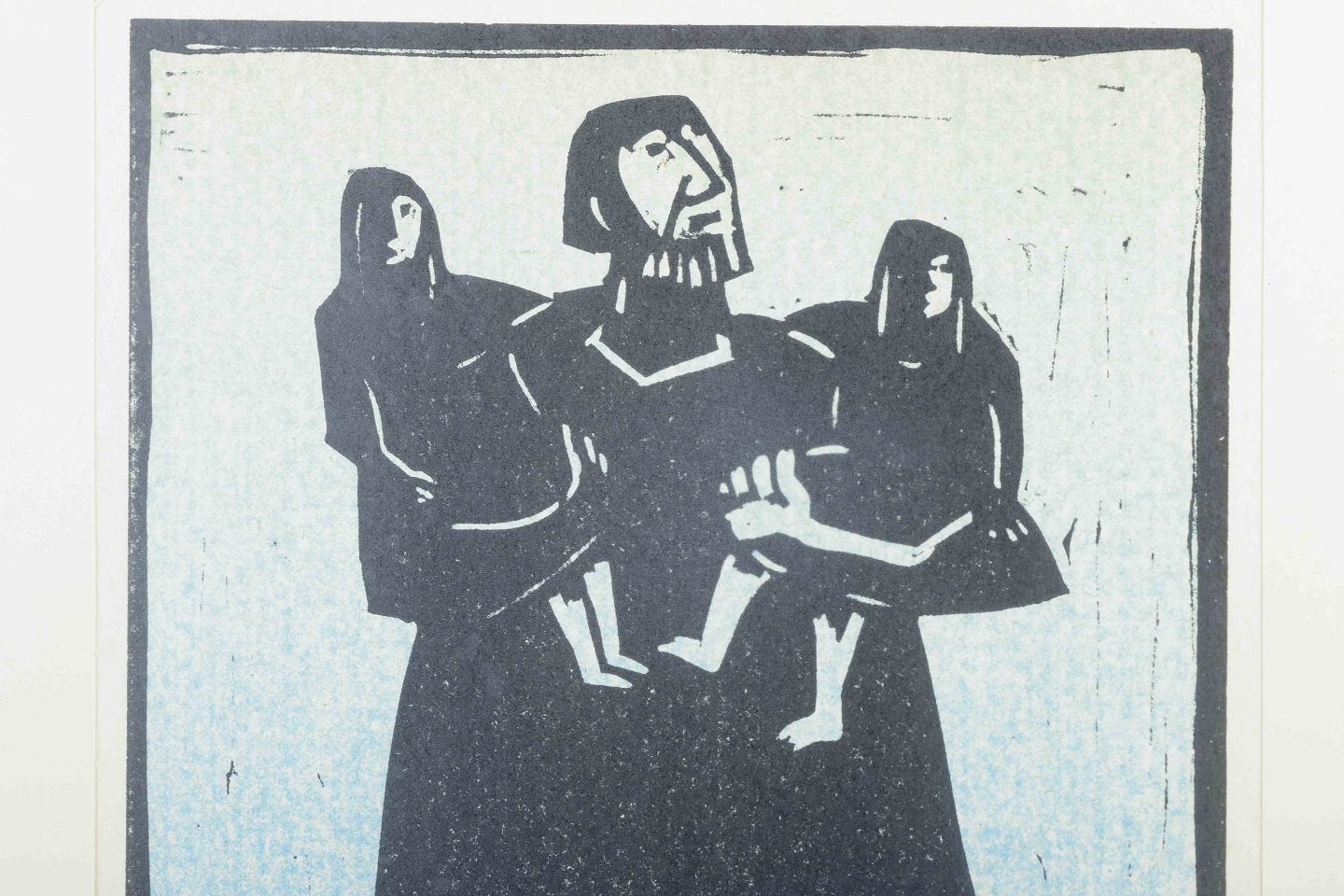 Et stærkt religiøst motiv, hvor patriarken Laban fremstilles med sine to døtre i armene. Kompositionen er forenklet til kraftige, mørke konturer mod en lys baggrund, hvilket giver værket en monumental og ikonisk karakter. Holm forener her en bibelsk fortælling med et udtryk, der både rummer arkaisk tyngde og moderne stramhed.