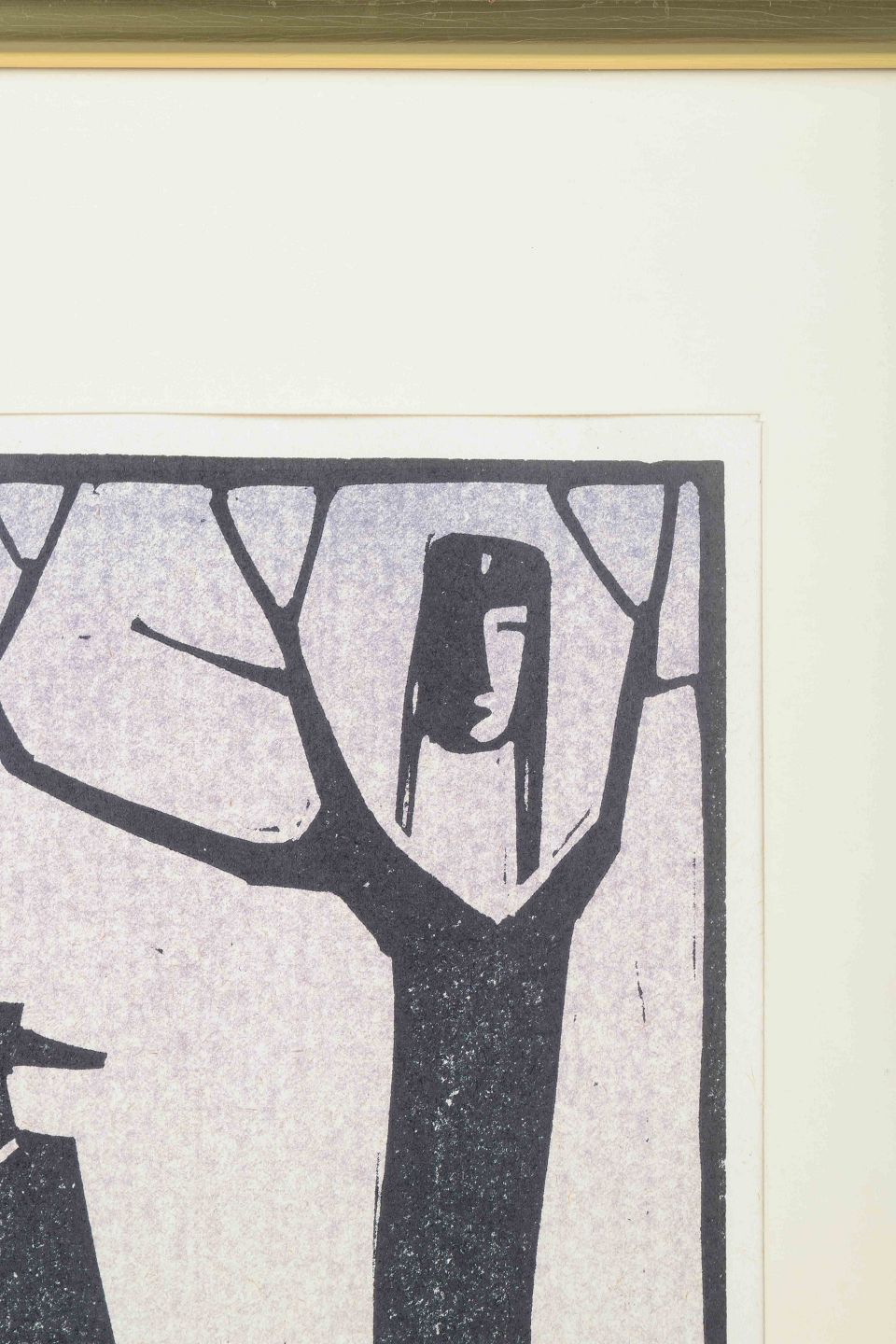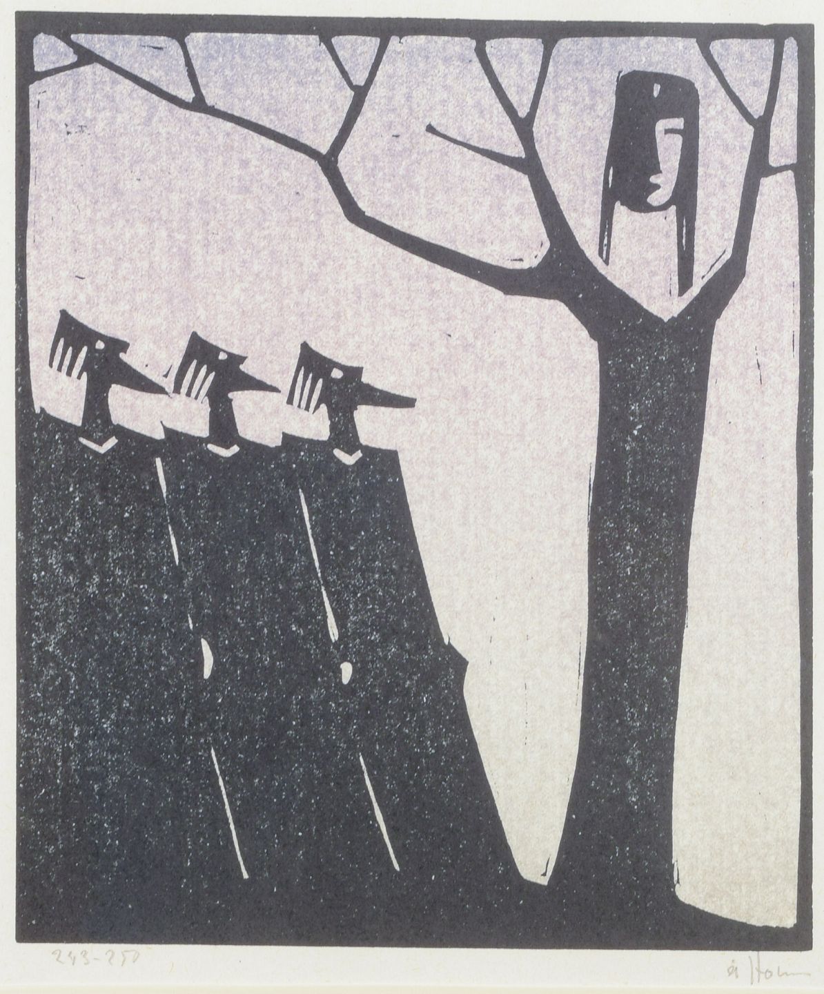 Et dramatisk grafisk værk, hvor tre stiliserede skikkelser – de vise mænd – nærmer sig Maria, der fremstår som en ikonisk figur integreret i træets form. Den monumentale enkelhed, de stærke kontraster og motivets symbolske tyngde vidner om Holms særlige evne til at forene det religiøse billedsprog med en stram modernistisk æstetik.
