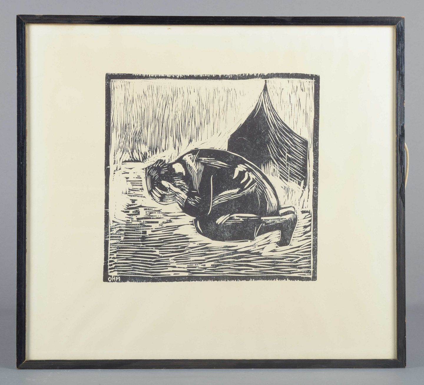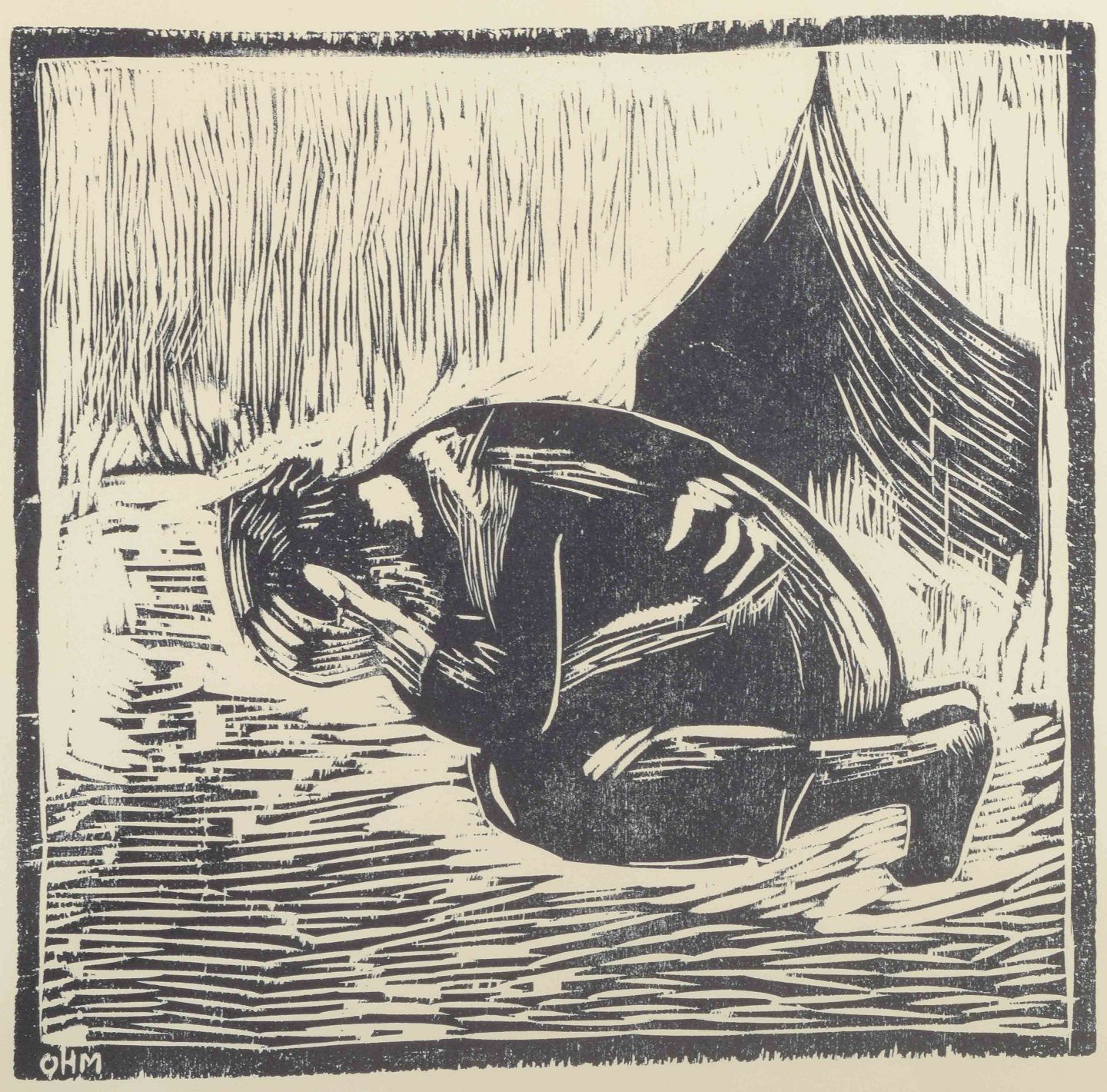 Et stærkt ekspressivt træsnit af Olivia Holm-Møller, hvor den knælende figur skildres med dramatisk enkelhed og dyb menneskelig resonans. Kompositionen bærer præg af kunstnerens karakteristiske brug af kontraster og monumentale former, hvor åndelighed og eksistens mødes i billedsproget.