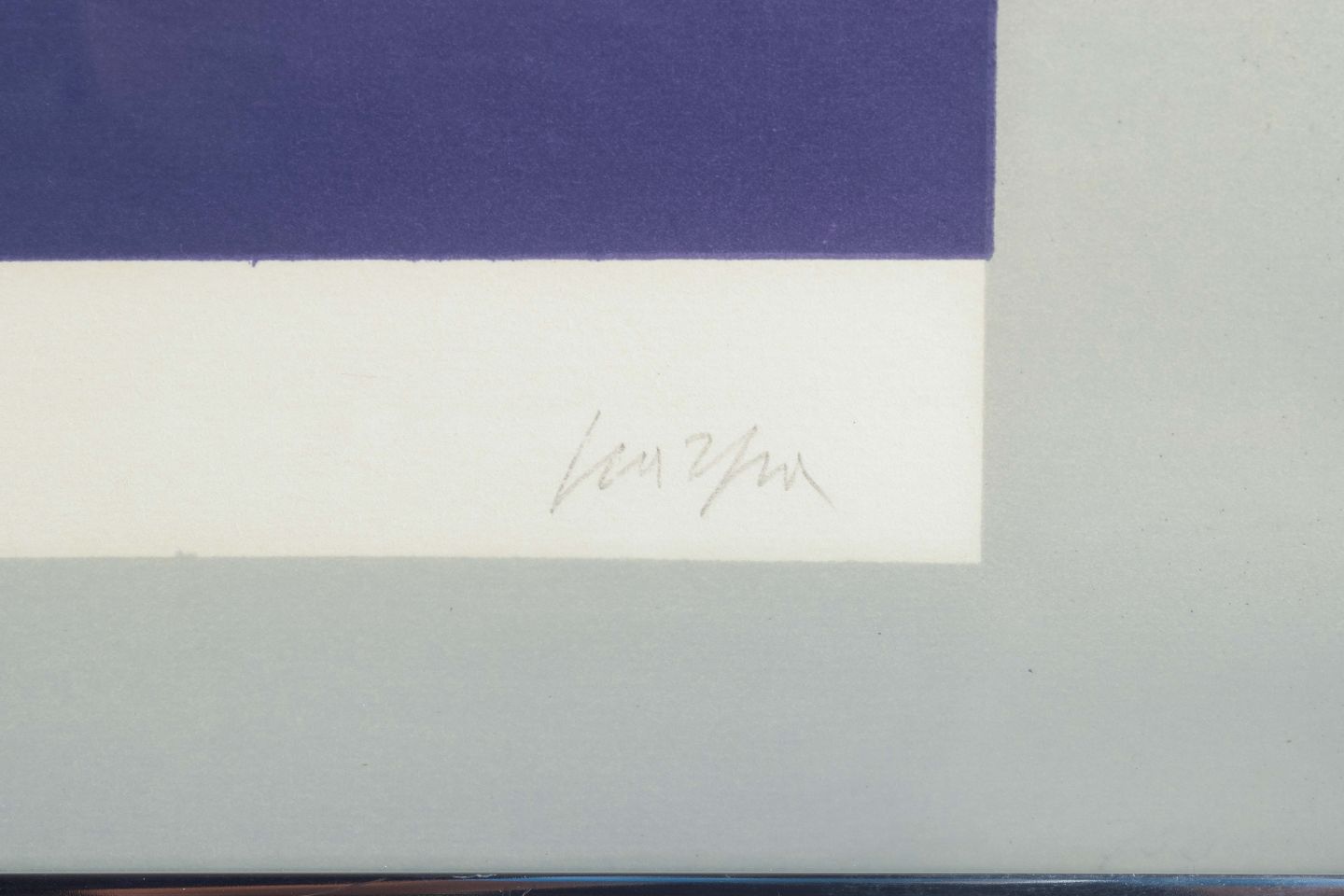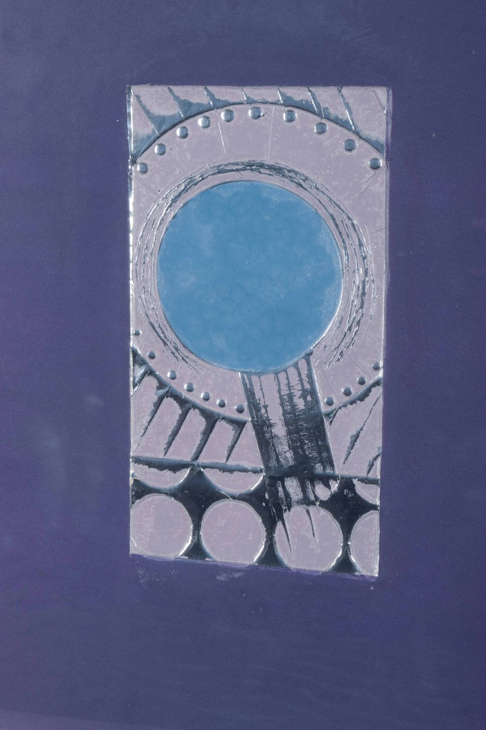 Et karakteristisk grafisk arbejde af Gino Scarpa, hvor geometriske former og kontrasterende farver kombineres med bladsølv, hvilket skaber en poetisk balance mellem abstraktion og symbolik