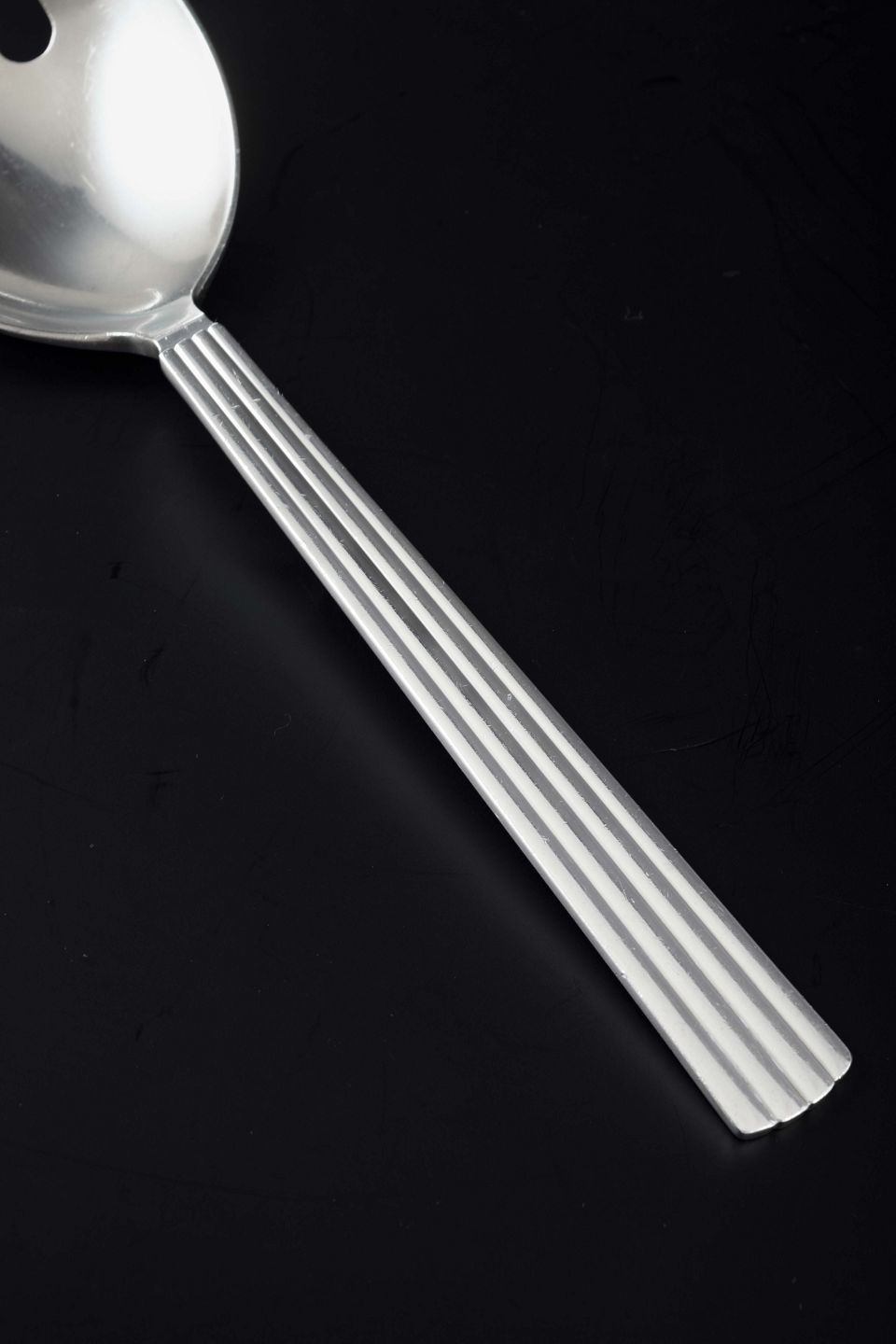 Serveringsske / salatske i sterling sølv i det ikoniske Bernadotte-mønster, designet af Sigvard Bernadotte. Den karakteristiske udskårne skål kombinerer funktionalitet og elegance, mens skaftets parallelle rifler gør bestikket til et af Georg Jensens mest populære og klassiske designs.