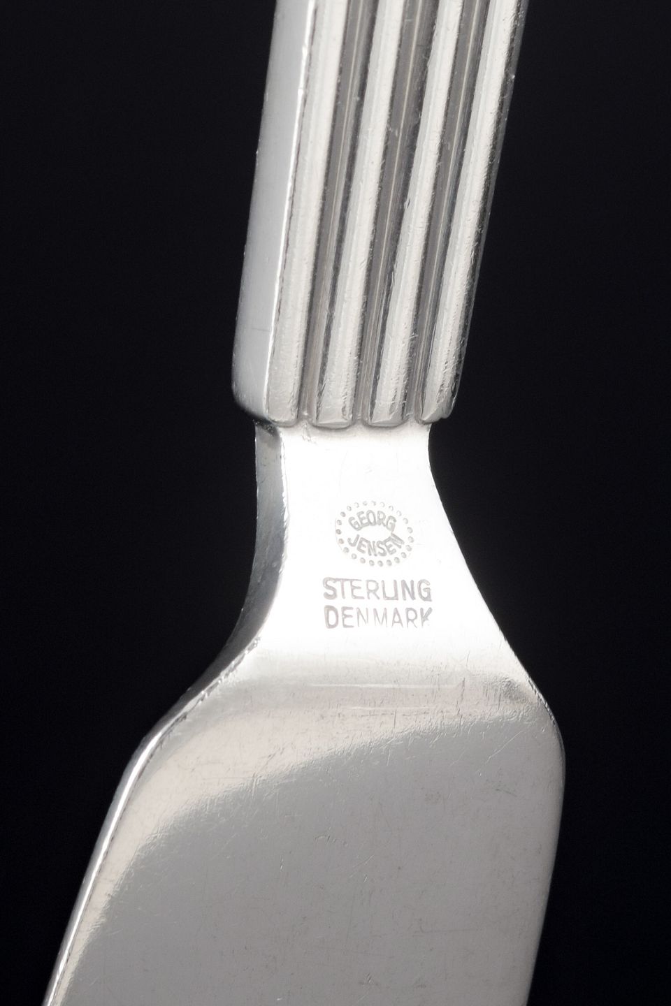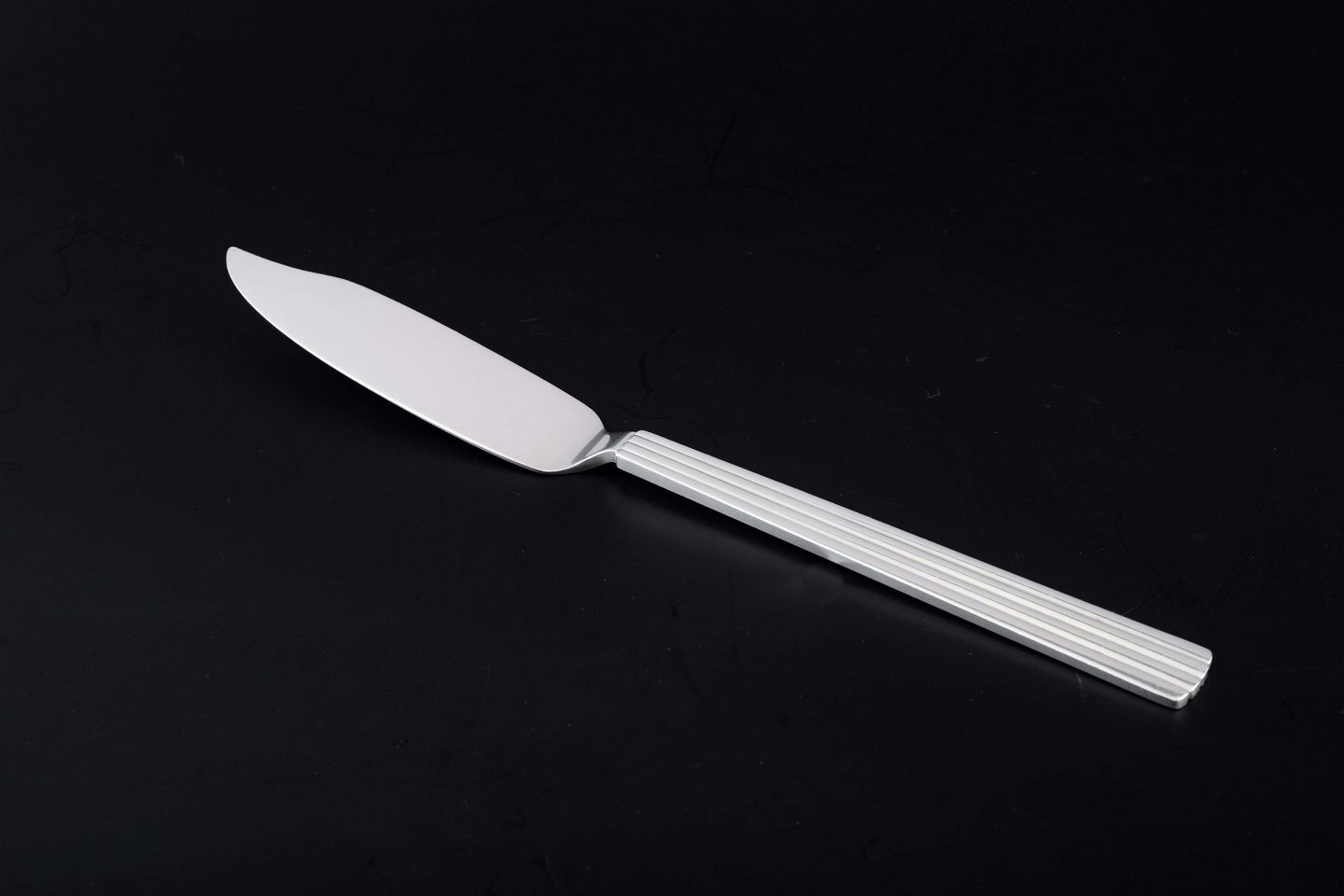 Fiskekniv i sterling sølv i det ikoniske Bernadotte-mønster, designet af Sigvard Bernadotte. Det tidløse formsprog med parallelle rifler i skaftet gør bestikket til et af Georg Jensens mest populære og klassiske designs.