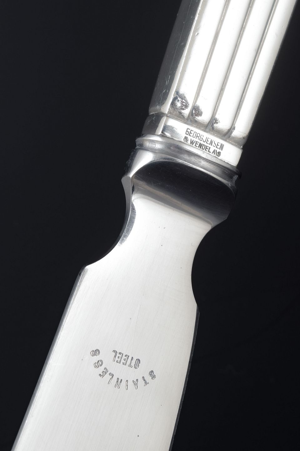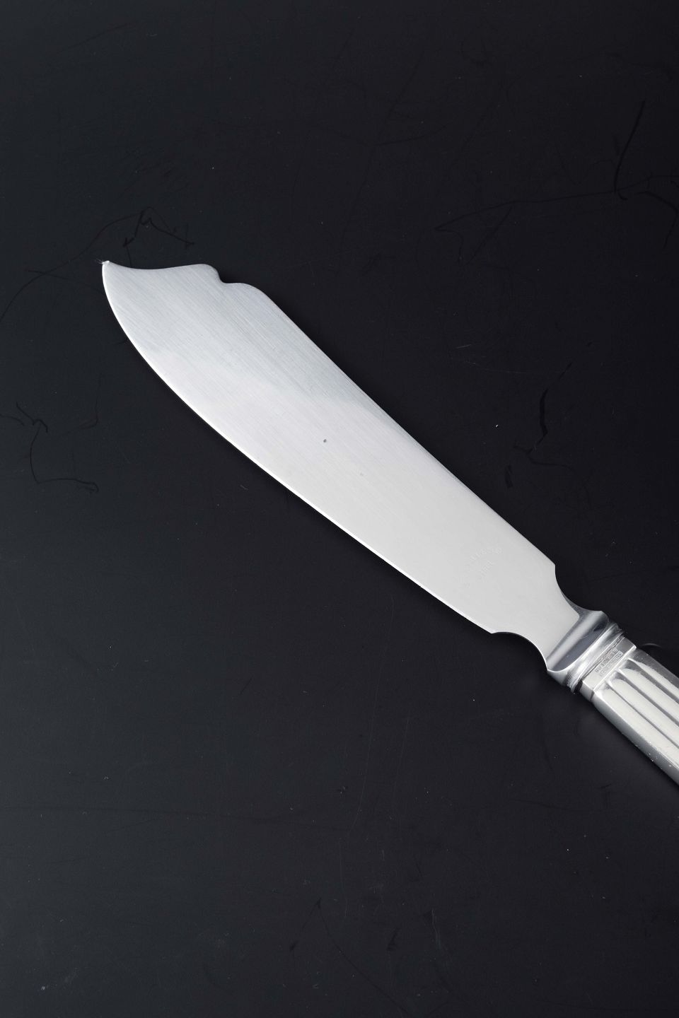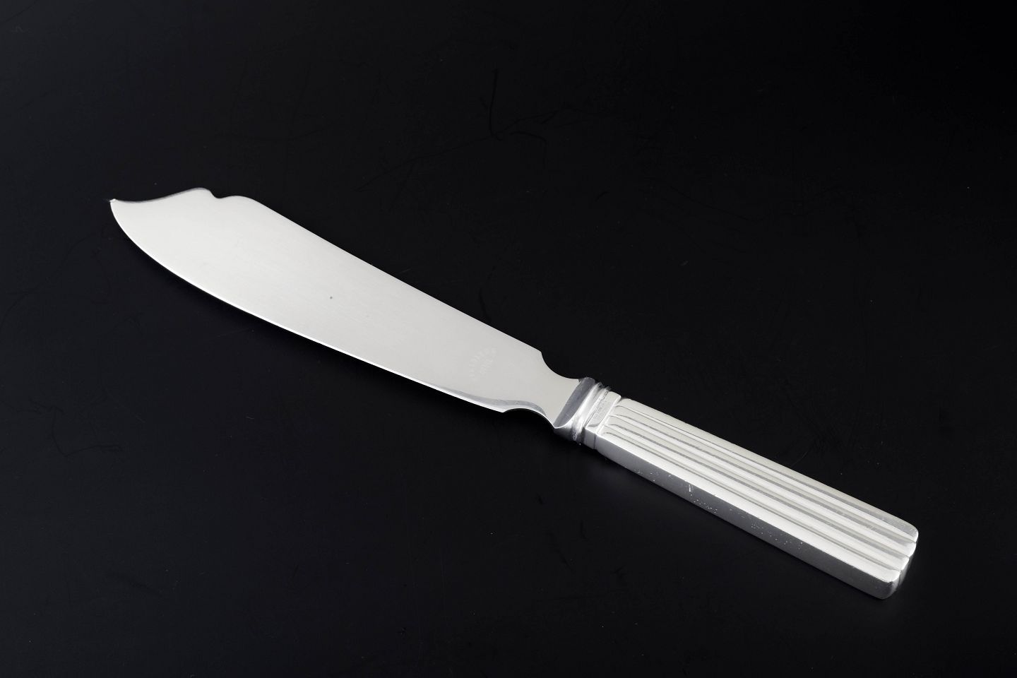Lagkagekniv i sterling sølv og rustfrit stål i det ikoniske Bernadotte-mønster, designet af Sigvard Bernadotte. Det tidløse formsprog med parallelle rifler i skaftet gør bestikket til et af Georg Jensens mest populære og klassiske designs.