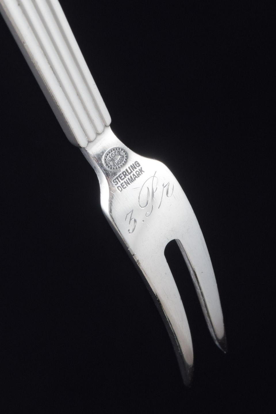 Sterling sølv pålægsgaffel i det ikoniske Bernadotte-mønster, designet af Sigvard Bernadotte. Det tidløse formsprog med parallelle rifler i skaftet gør bestikket til et af Georg Jensens mest populære og klassiske designs.