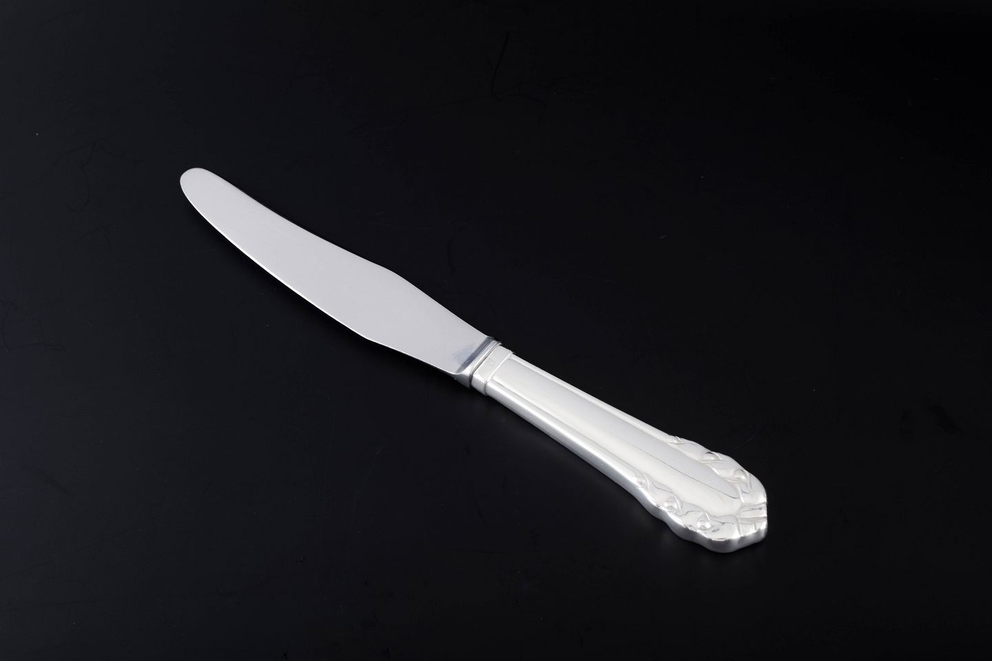 Frokostkniv i mønsteret "Liljekonval" (Lily of the Valley). Blankpoleret sterling sølv, elegant skaftafslutning med diskret blomster- og bladmotiv.