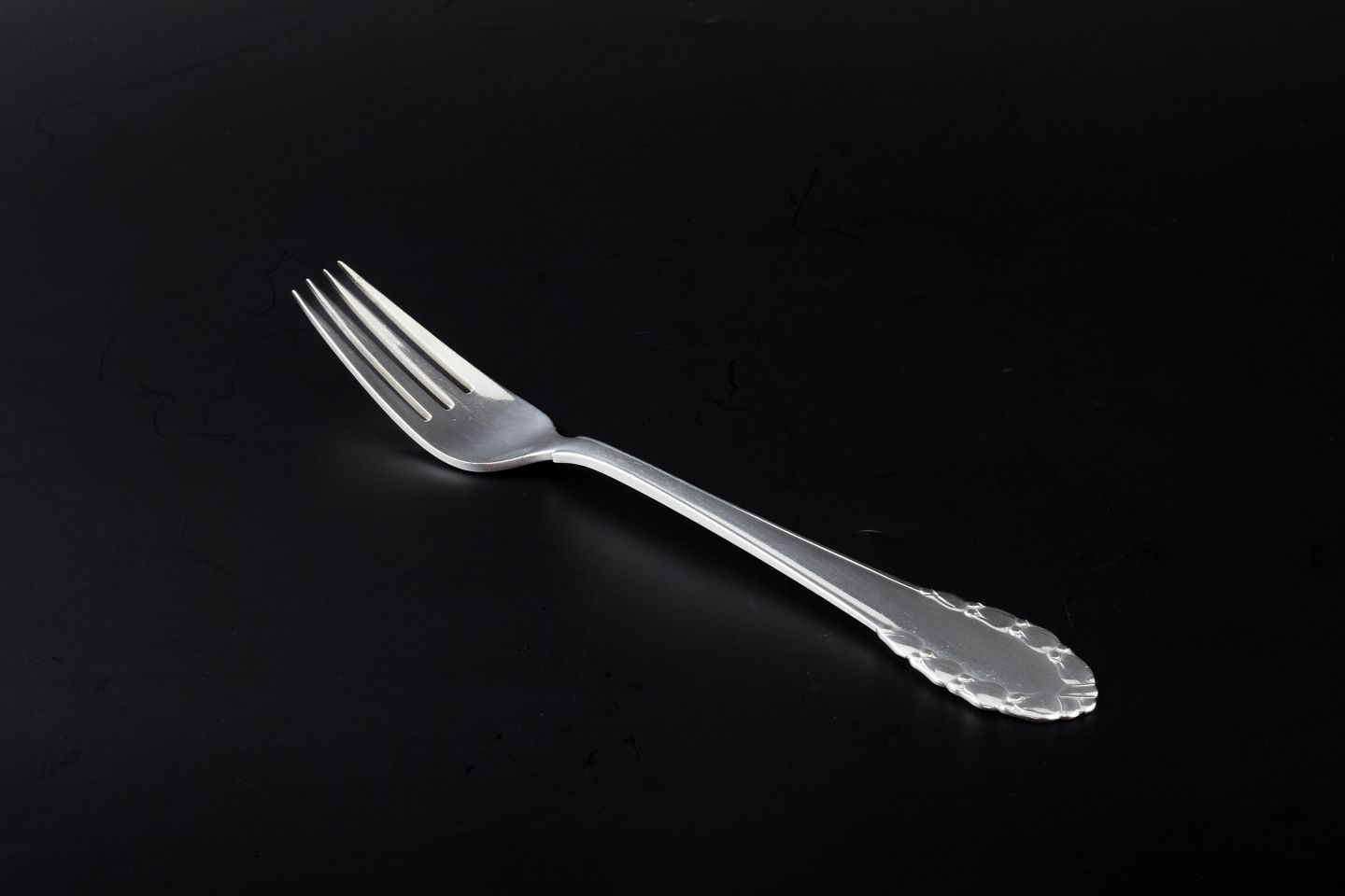 Middagsgaffel i mønsteret "Liljekonval" (Lily of the Valley). Blankpoleret sterling sølv, elegant skaftafslutning med diskret blomster- og bladmotiv.