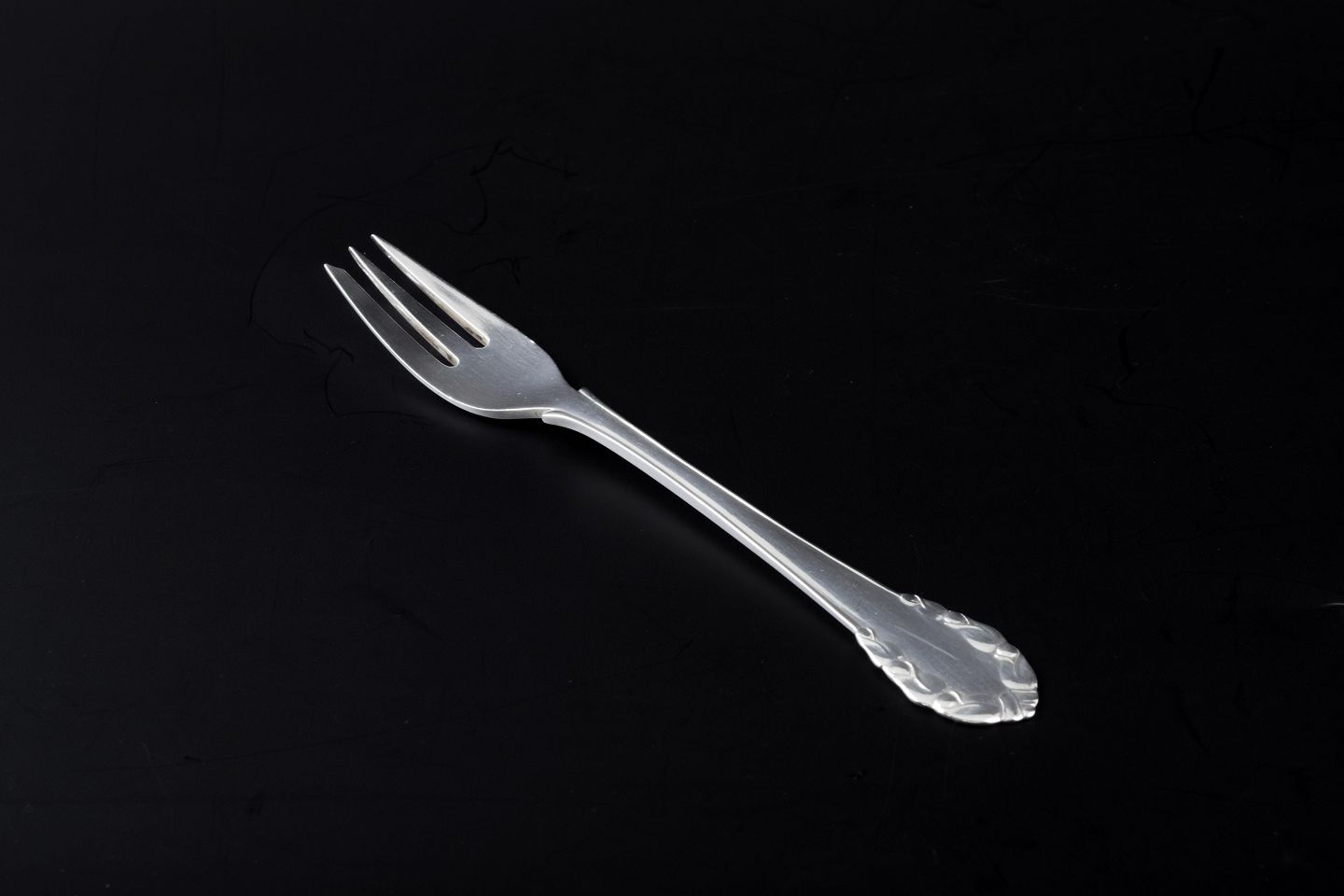 Kagegaffel i mønsteret "Liljekonval" (Lily of the Valley). Blankpoleret sterling sølv, elegant skaftafslutning med diskret blomster- og bladmotiv.