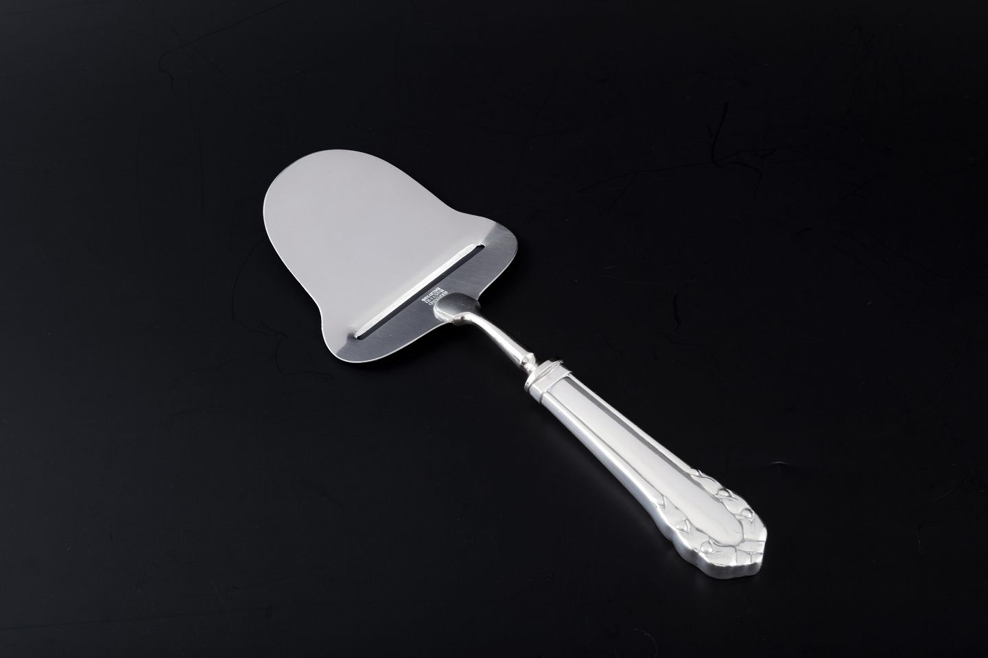Ostehøvl i mønsteret "Liljekonval" (Lily of the Valley). Blankpoleret sterling sølv, elegant skaftafslutning med diskret blomster- og bladmotiv.