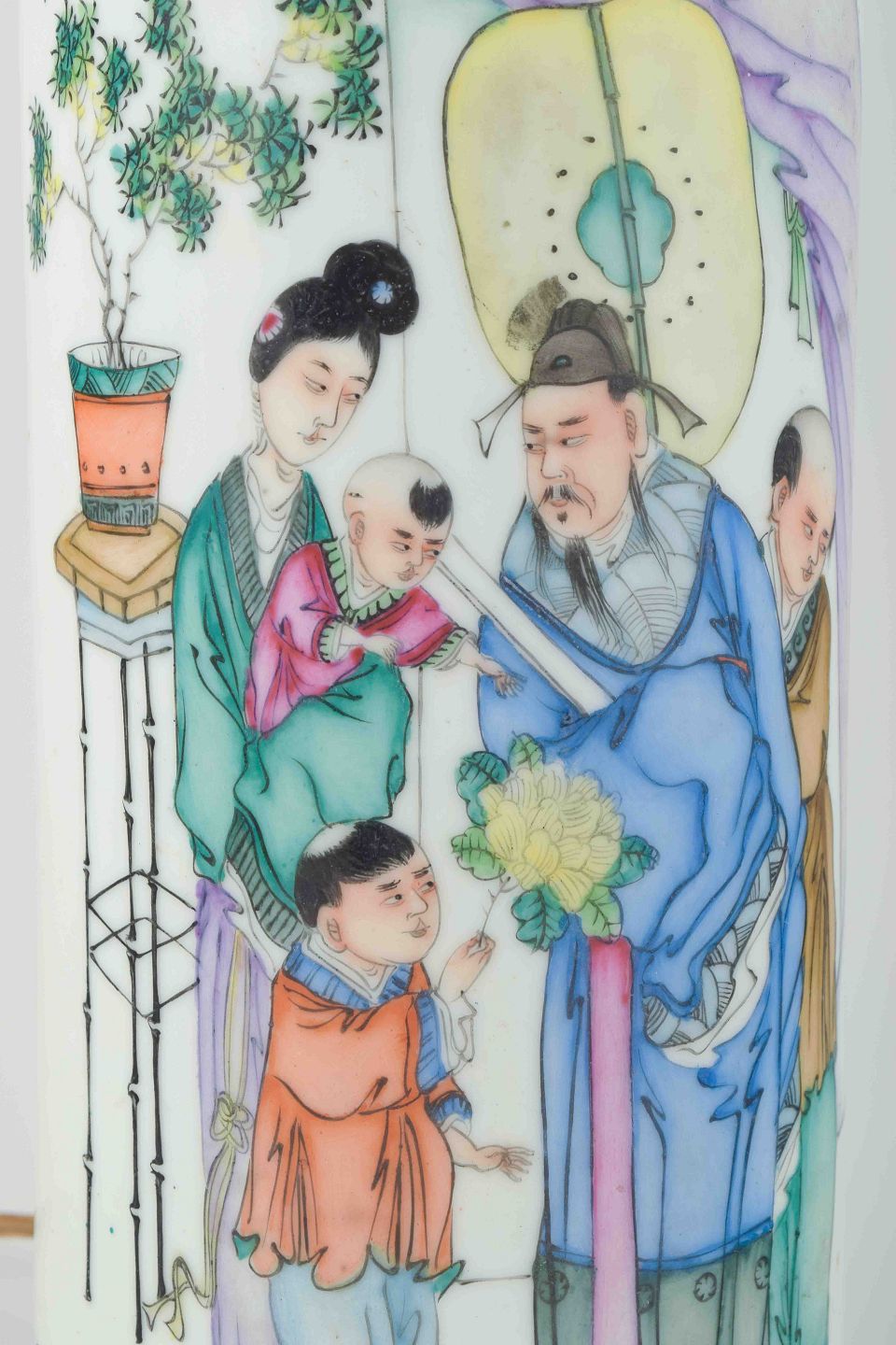 Porcelæn dekoreret i famille rose med figurscene, der viser en lærdomsmand omgivet af kvinde og børn i et interiør. Motivet er et klassisk fu gui (lykke og velsignelse) motiv, meget anvendt i Qing-dynastiet. Med kalligrafi og rødt seglstempel. Undersiden med blåt stempel.