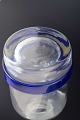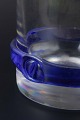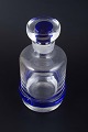Mundblæst karaffel i klart glas med tilhørende original prop. Dekoreret med pålagt kobaltblåt glasbånd om korpus samt knopdetalje, proppen med blå accent.