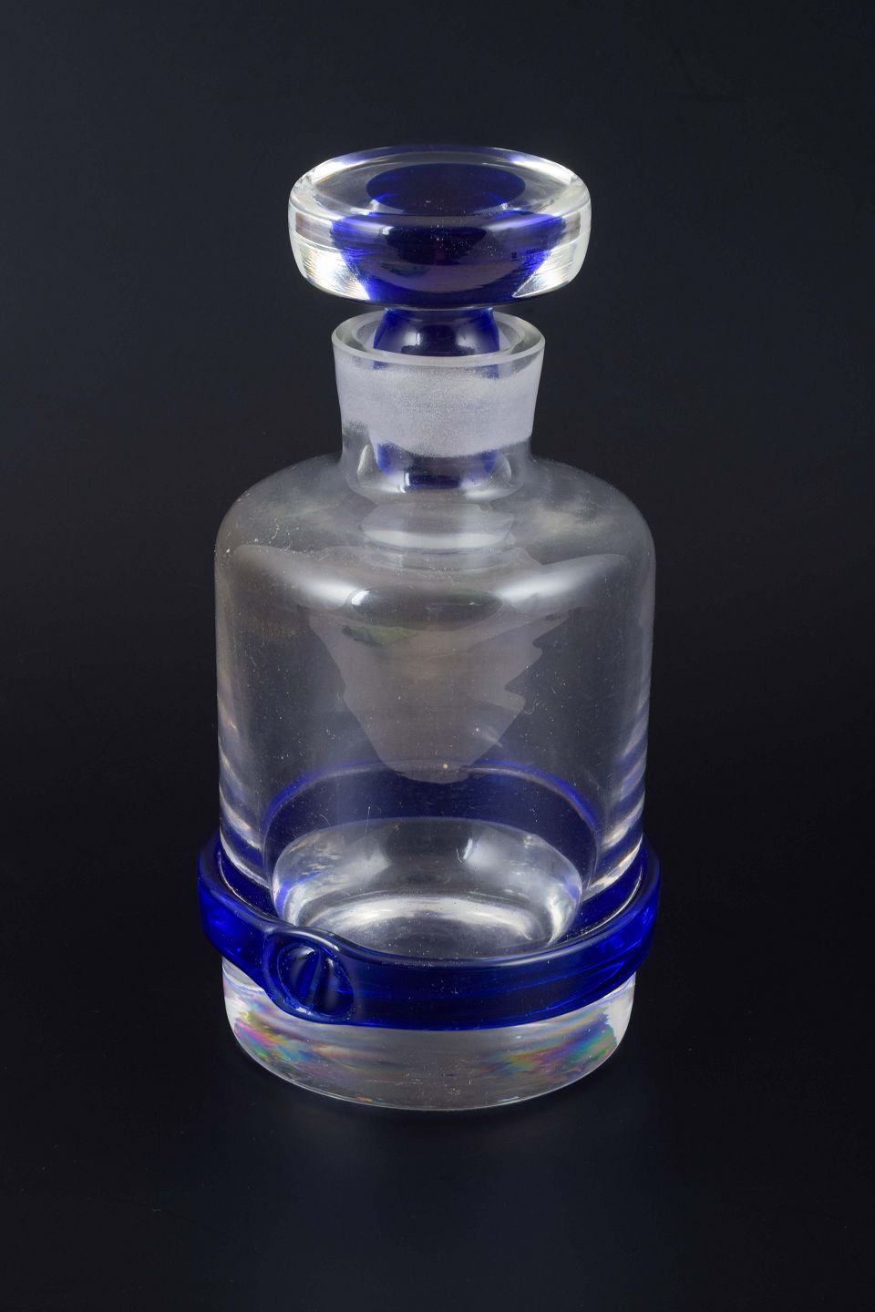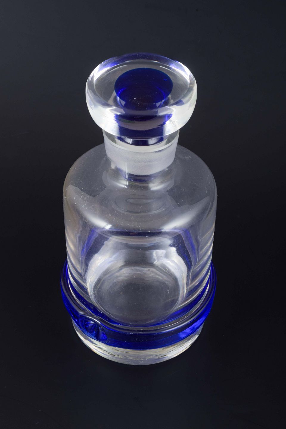 Karaffel med prop i klart og blåt glas. Formentlig Murano, Italien, midt 1900-tallet.