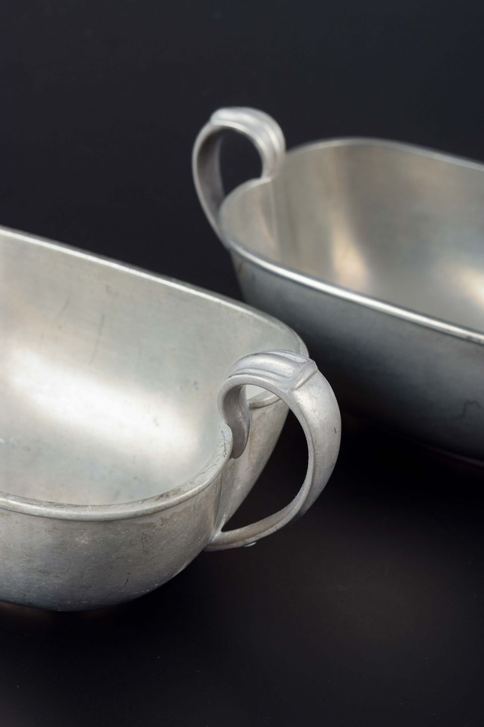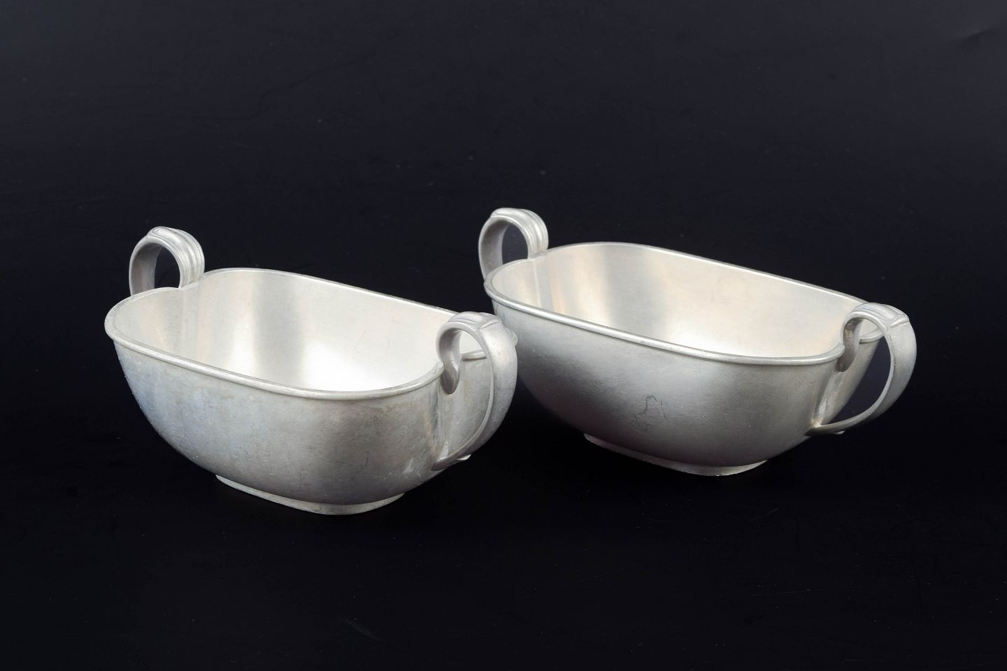 Et par elegante serveringsskåle fra Just Andersen, udført i tin. De bløde, stramme former og de karakteristiske hanke afspejler den danske art deco-stil, som Andersen blev internationalt berømt for.