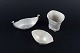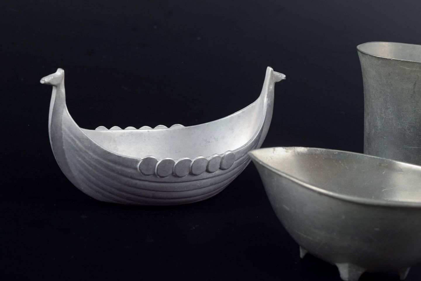 Lille vikingeskibsformet skål i tin sammen med to andre tinbeholdere. Skibet med stiliserede dragehoveder i enderne og skjolddekoration langs siderne.