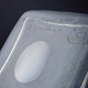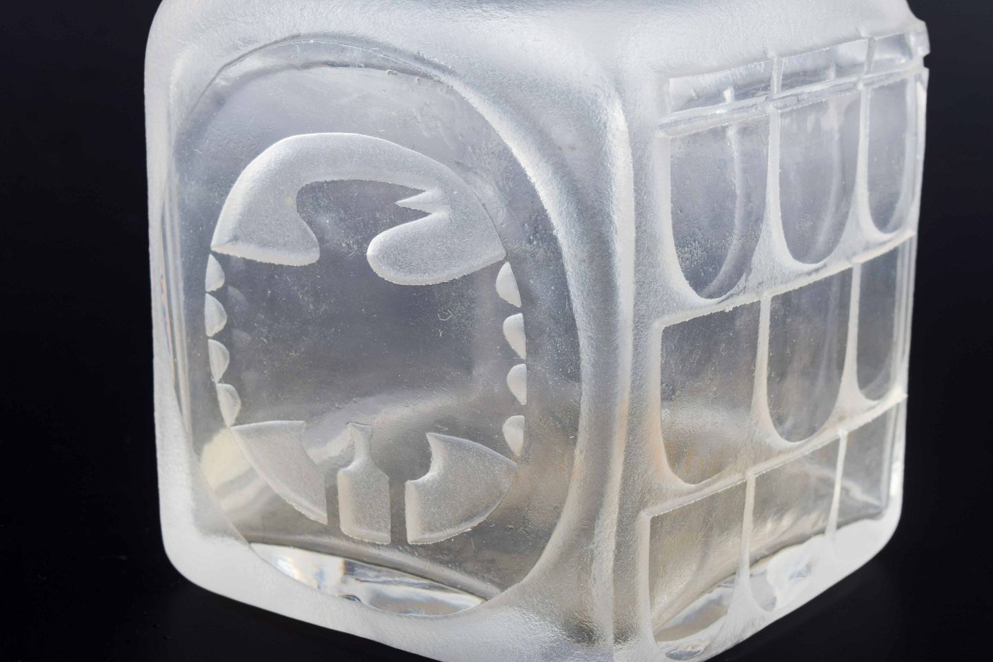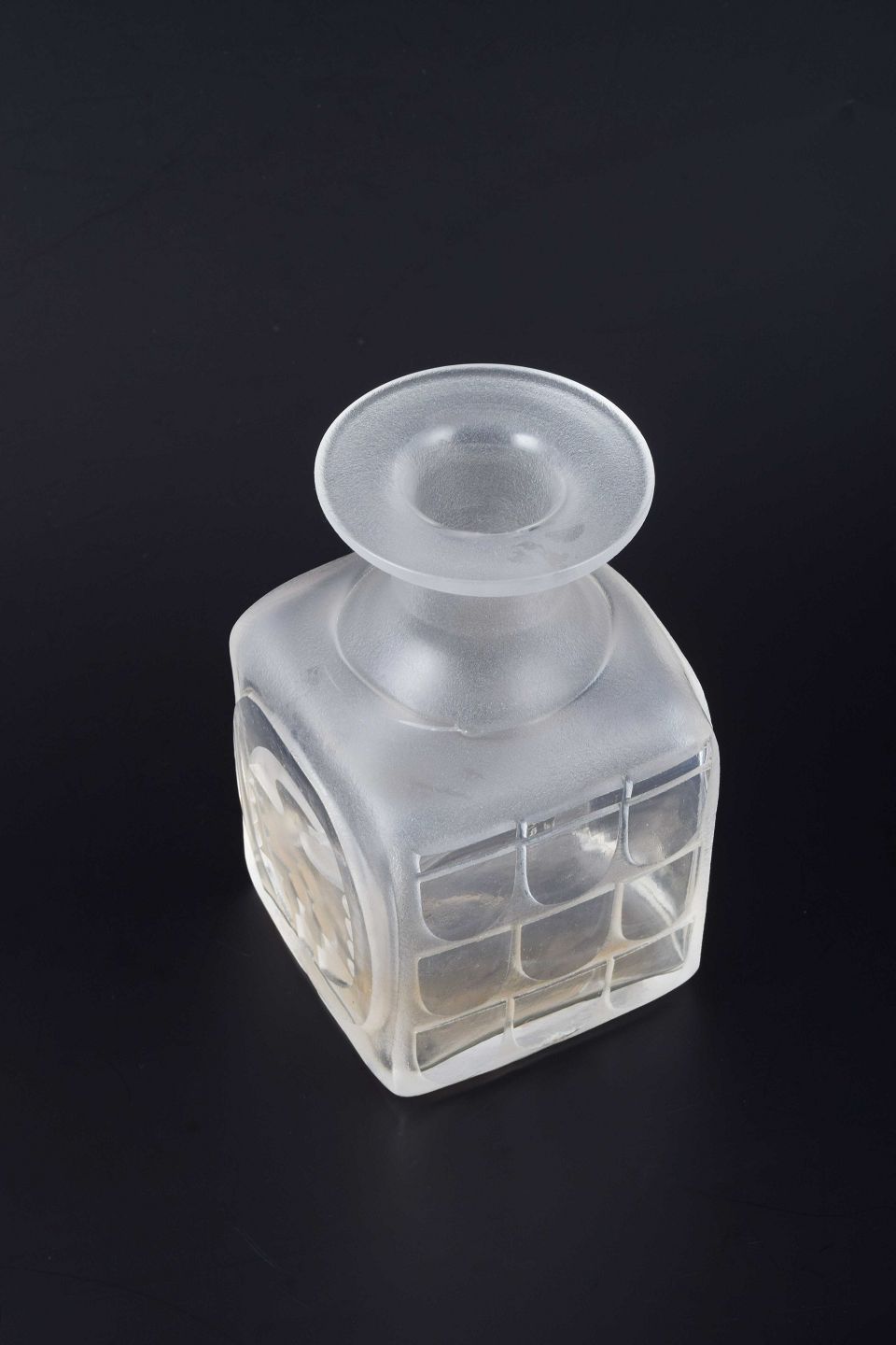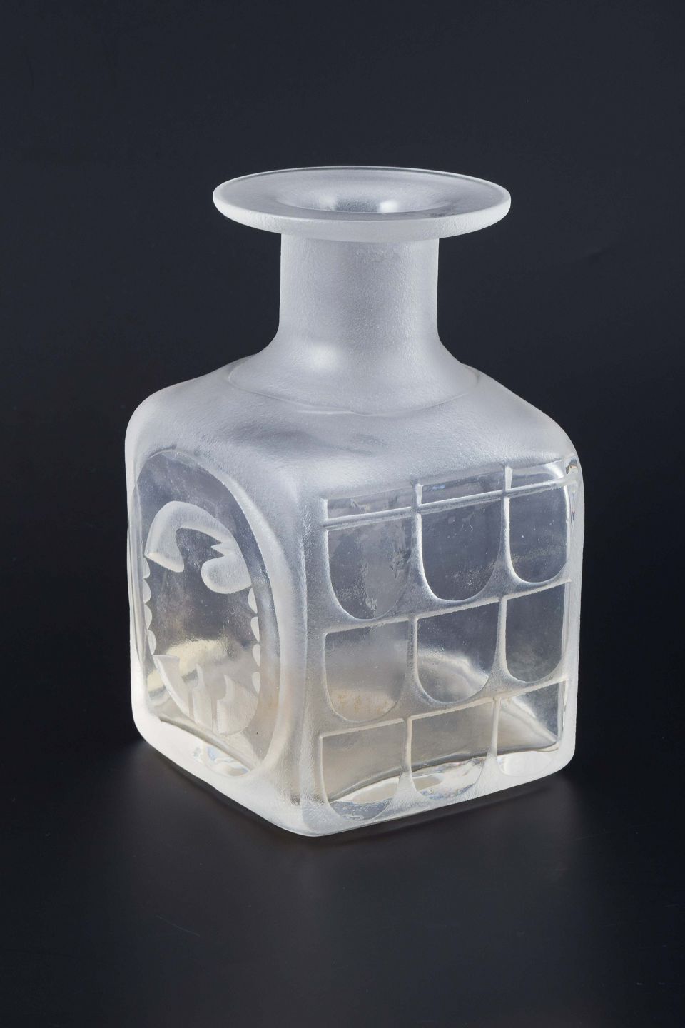 Firkantet vase i frosted glas med matteret overflade og reliefornamentik. Dekoreret med geometriske felter og et stiliseret fuglemotiv i relief på siderne.