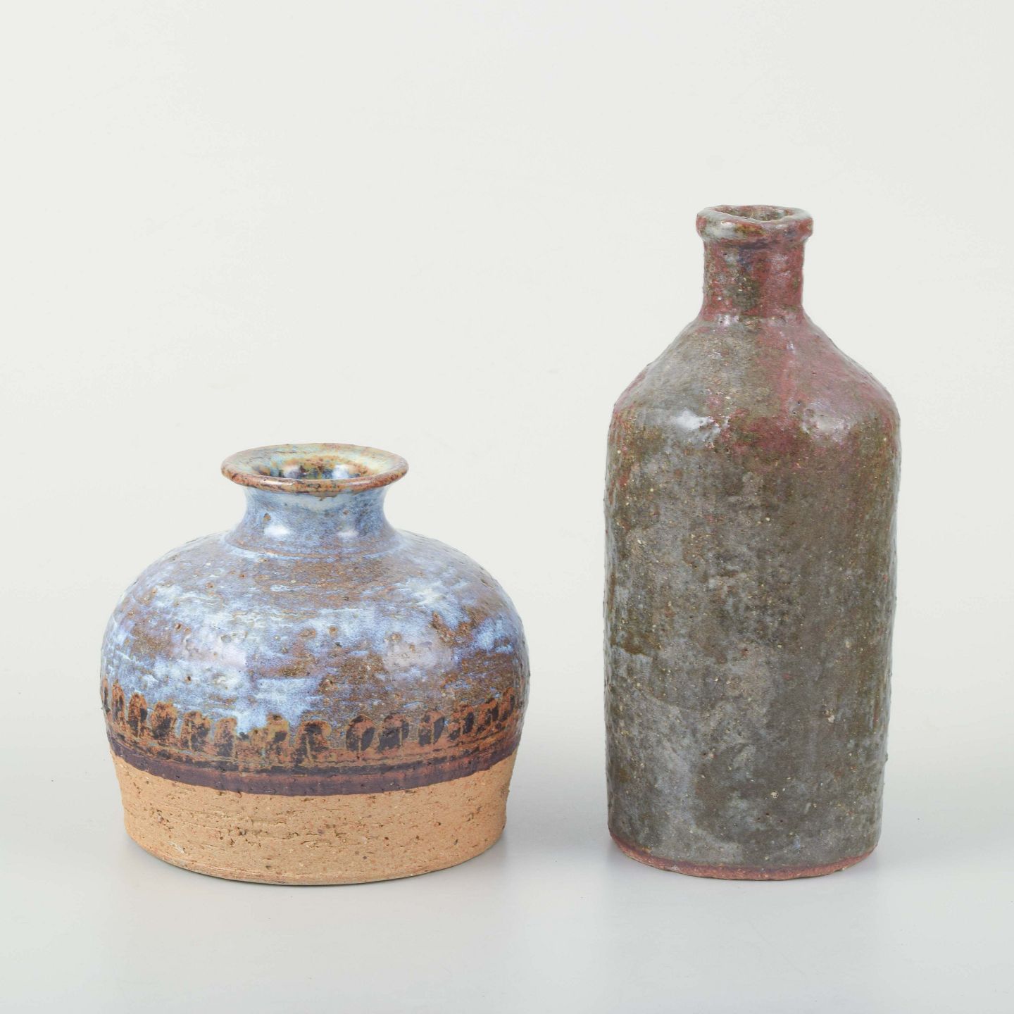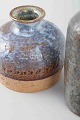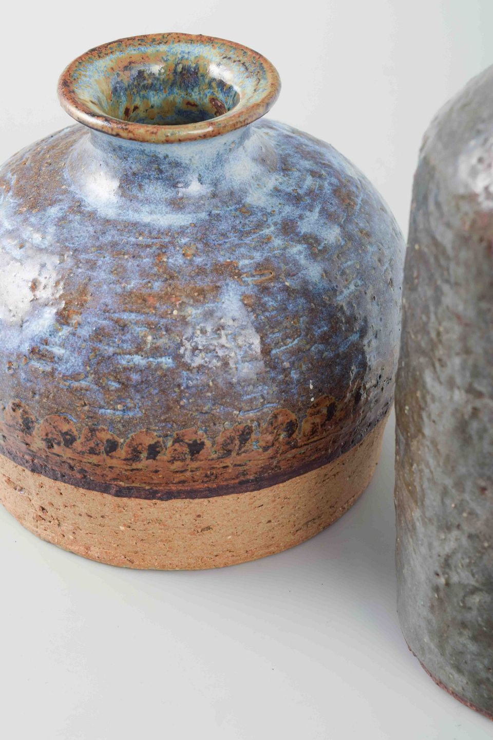 To vaser i stentøj, den ene med bred krop og udsvajet hals, dekoreret med blå og brun glasur over chamottéagtig bund, den anden cylindrisk med smal hals og rustik brunlig glasur med rødlige nuancer.