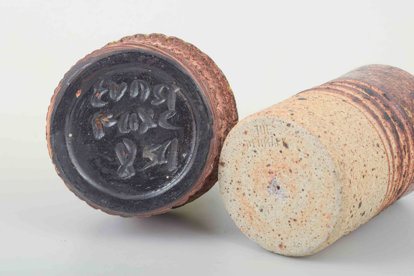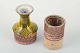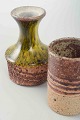To mindre vaser i stentøj, den ene cylindrisk formet med indridset signatur under bunden “Ernst Faxe”, den anden med udsvajet hals og gul-brun løbende glasur, stemplet Tue.