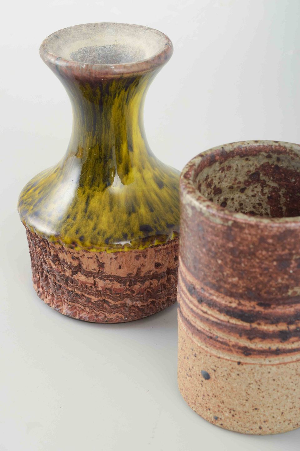 Et dekorativt par europæiske studiokeramiske vaser, der repræsenterer den rå og eksperimenterende æstetik, som prægede mange værksteder i 1960’erne og 1970’erne, hvor både form og glasur blev brugt som kunstnerisk udtryk.