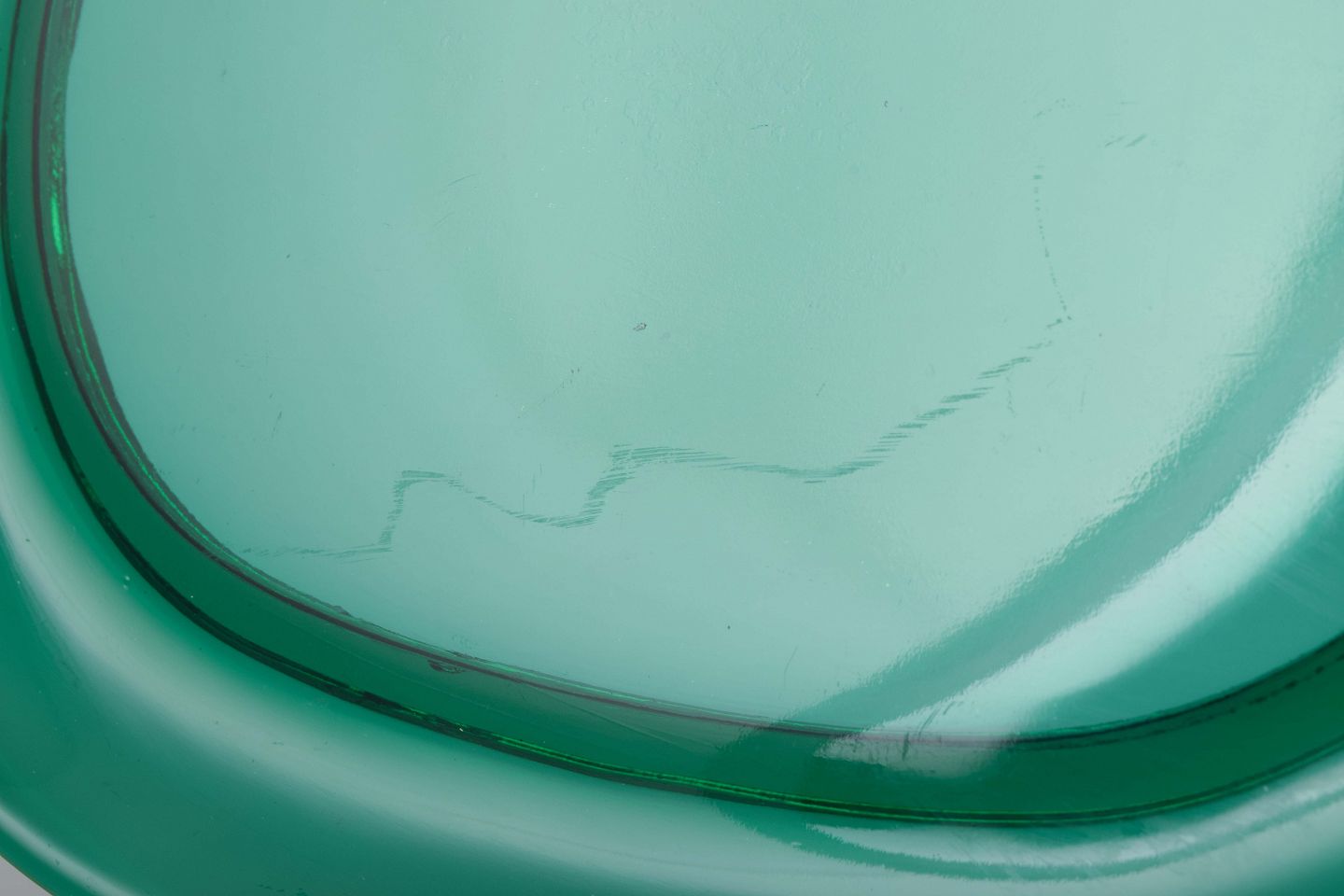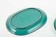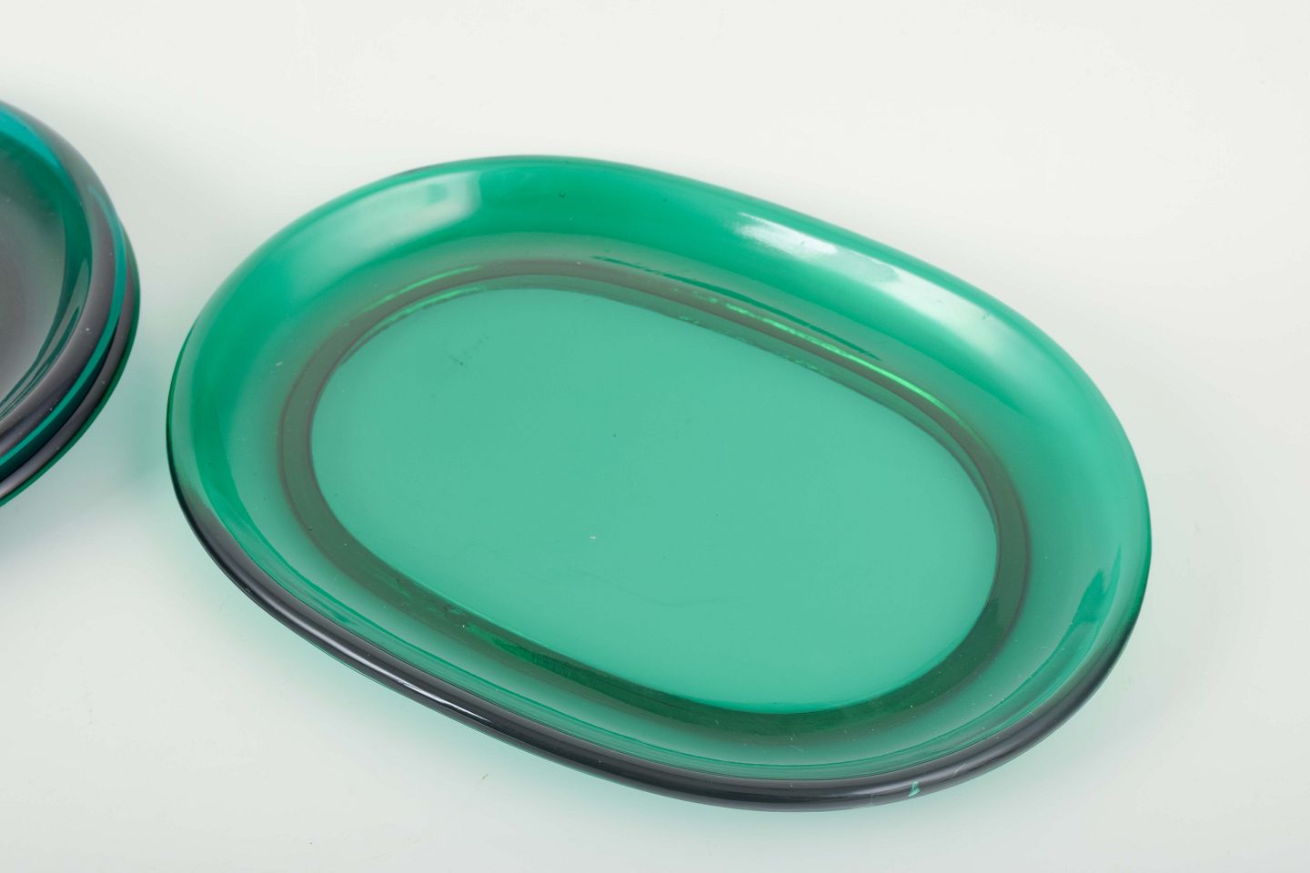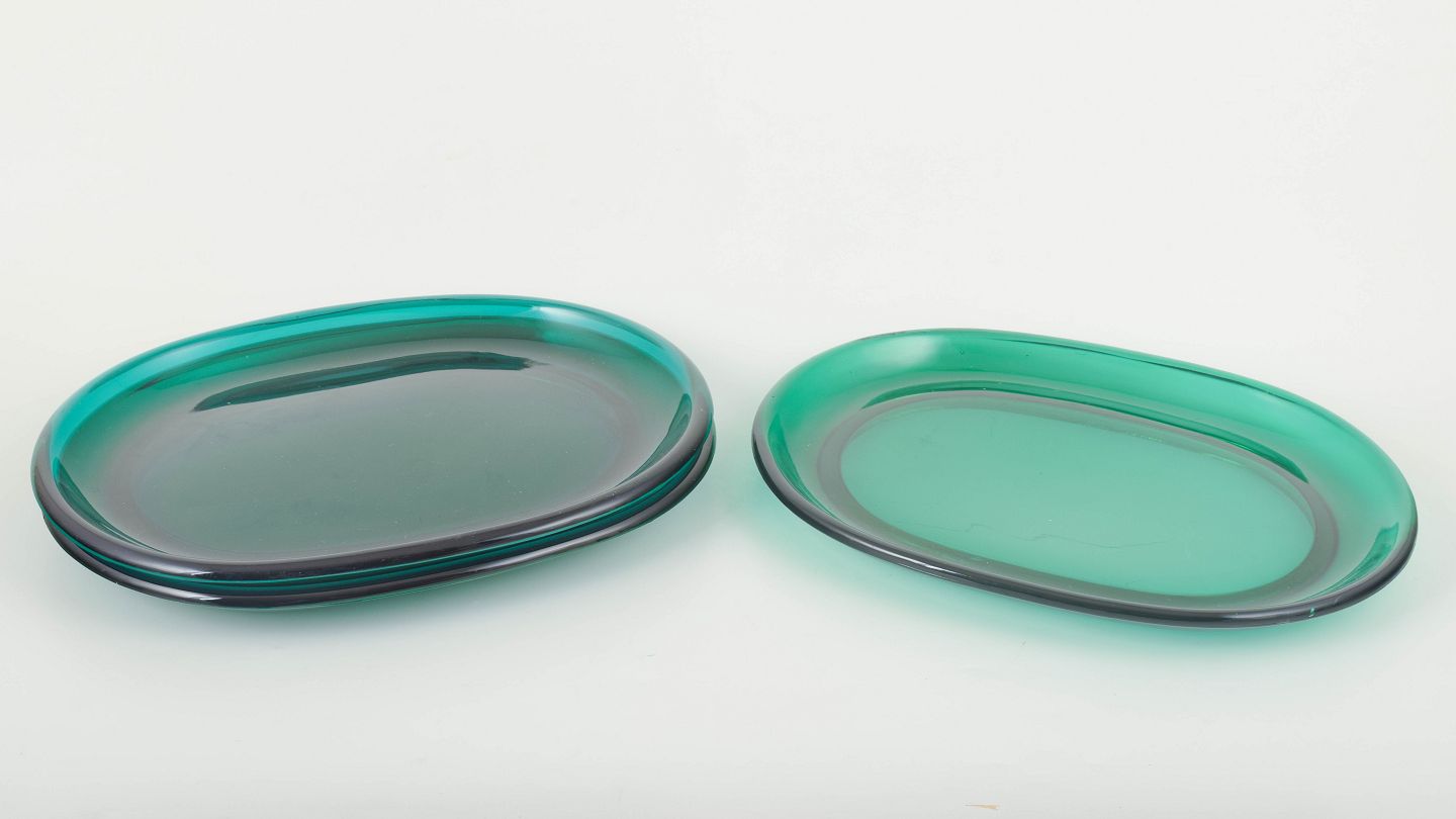 Tre ovale hummertallerkener i smaragdgrønt glas.