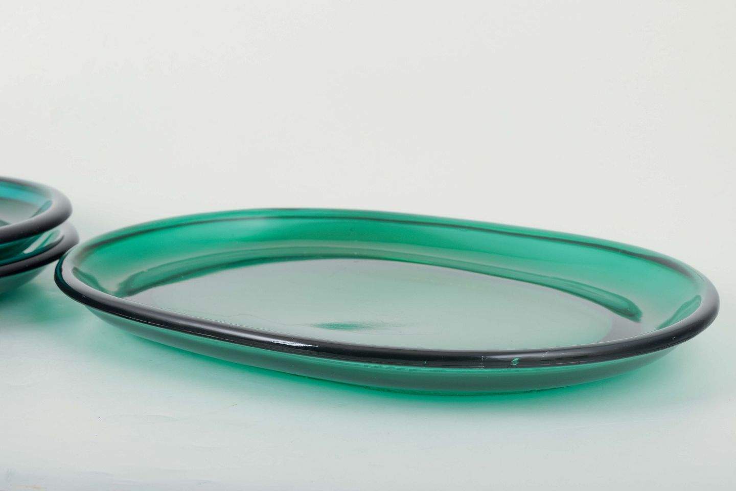 Et elegant sæt på tre hummertallerkener i glas designet af Josef Frank for Svenskt Tenn. De ovale former og den dybe grønne farvetone afspejler Franks karakteristiske kombination af funktionalitet og dekorativ æstetik, ideelle både som serveringsfade og som dekorative elementer.