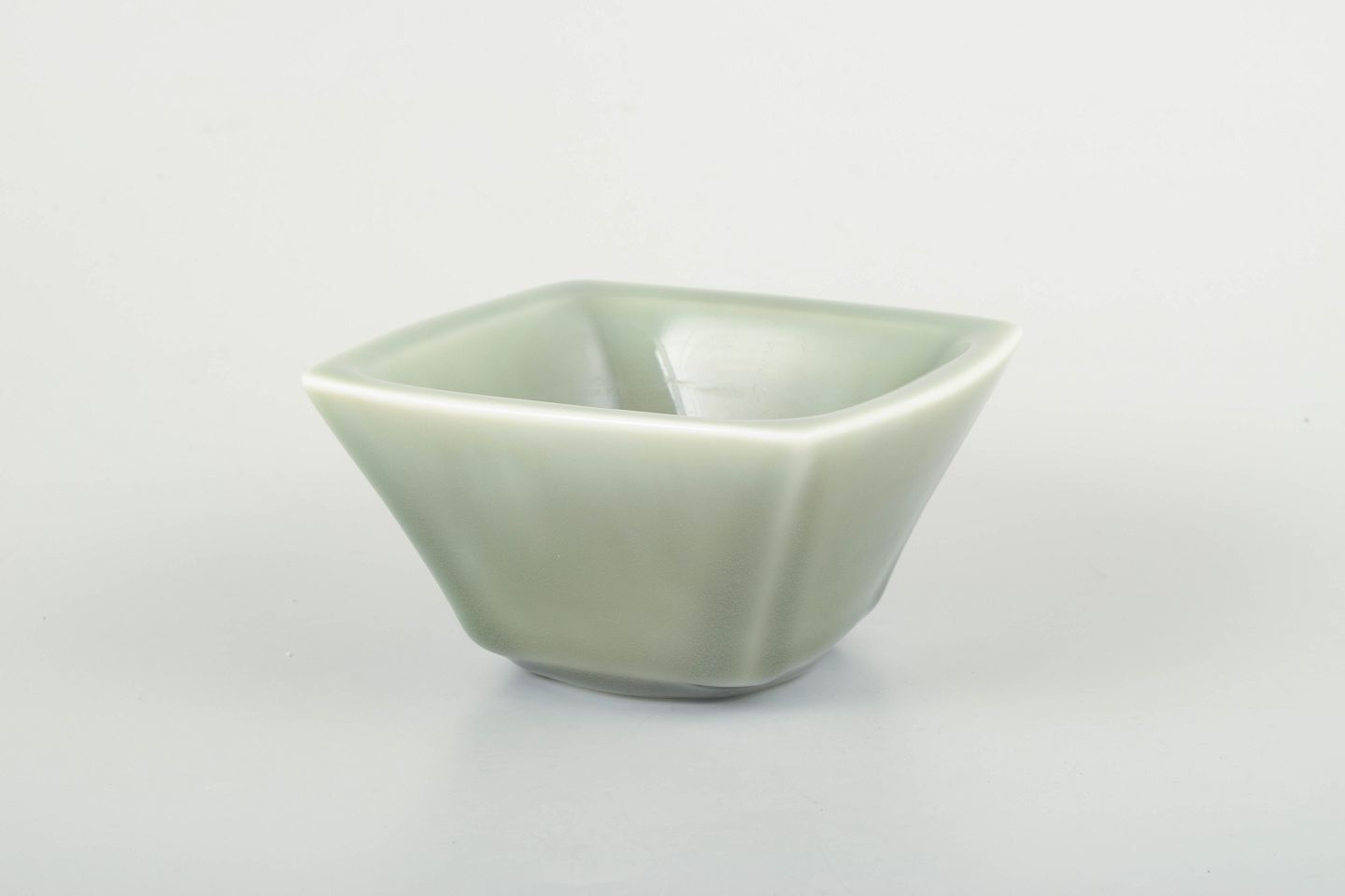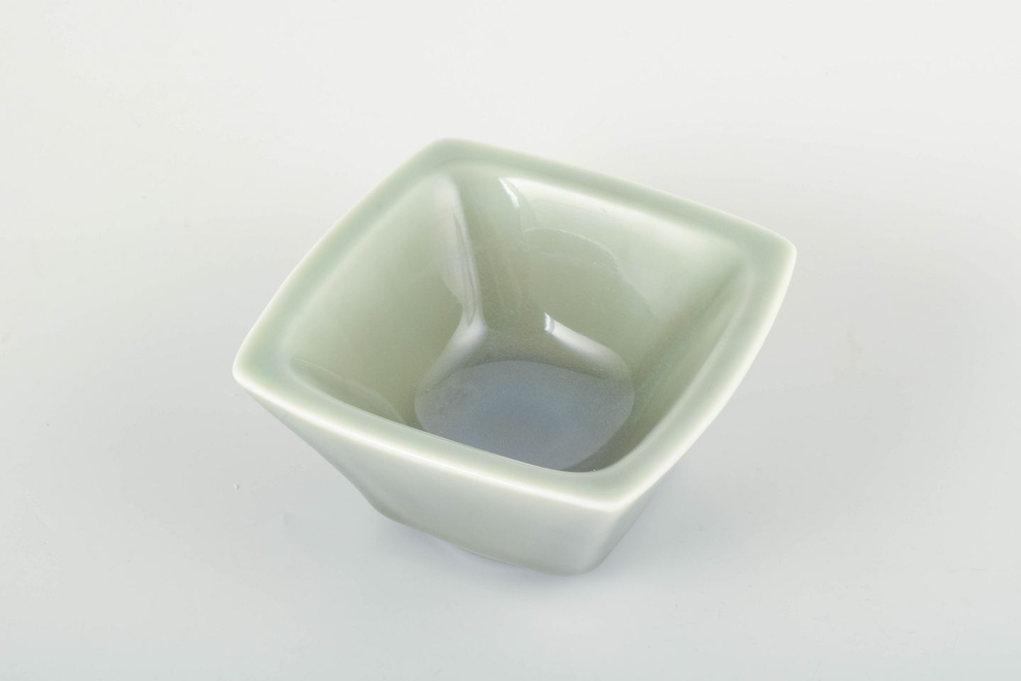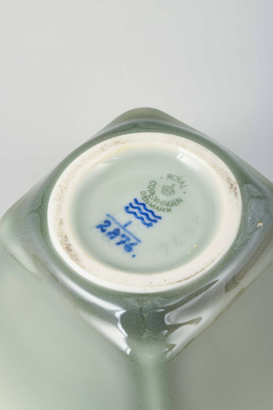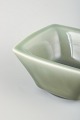 En elegant firkantet skål fra Royal Copenhagen i den karakteristiske grønne celadonglasur, designet af Nils Thorsson. Formen kombinerer modernistisk enkelhed med subtile proportioner, der giver værket både funktionalitet og dekorativ værdi.