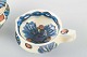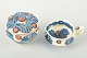 Flødekande og sukkerskål i Marguerite-stellet, glaseret keramik hånddekoreret med polykrome blomster- og rankemotiver i blå og rødlig glasur på lys bund.