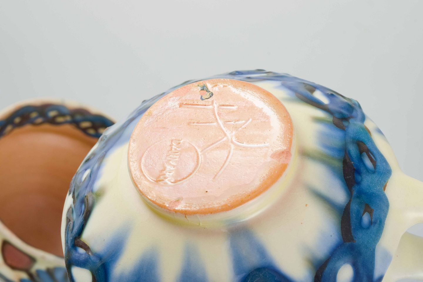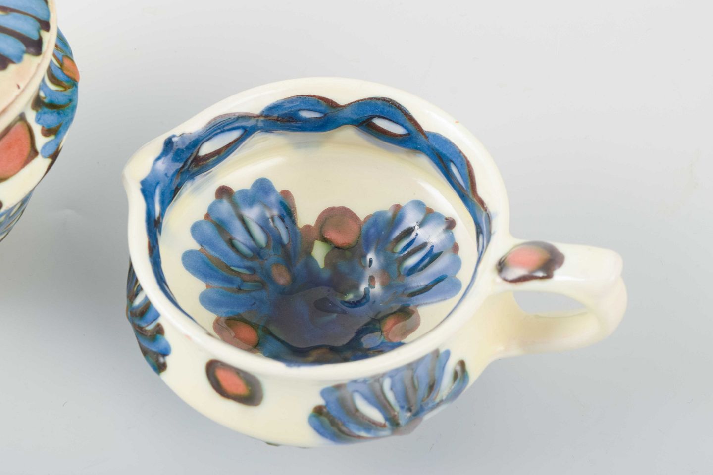 Et dekorativt sæt bestående af flødekande og sukkerskål fra Kählers berømte Marguerite-stel, hvor traditionelle former og farver forenes i et udtryk, der kombinerer brugskunst med dekorativ folkekunst.