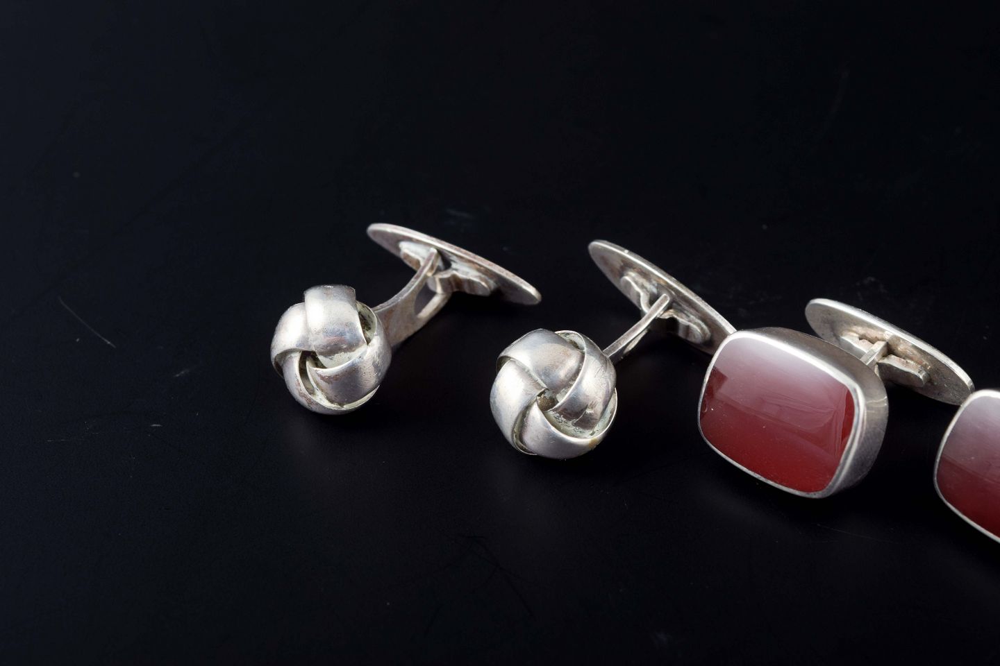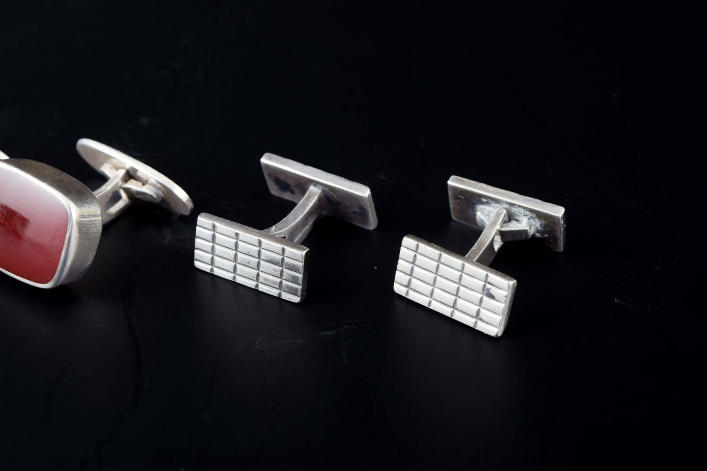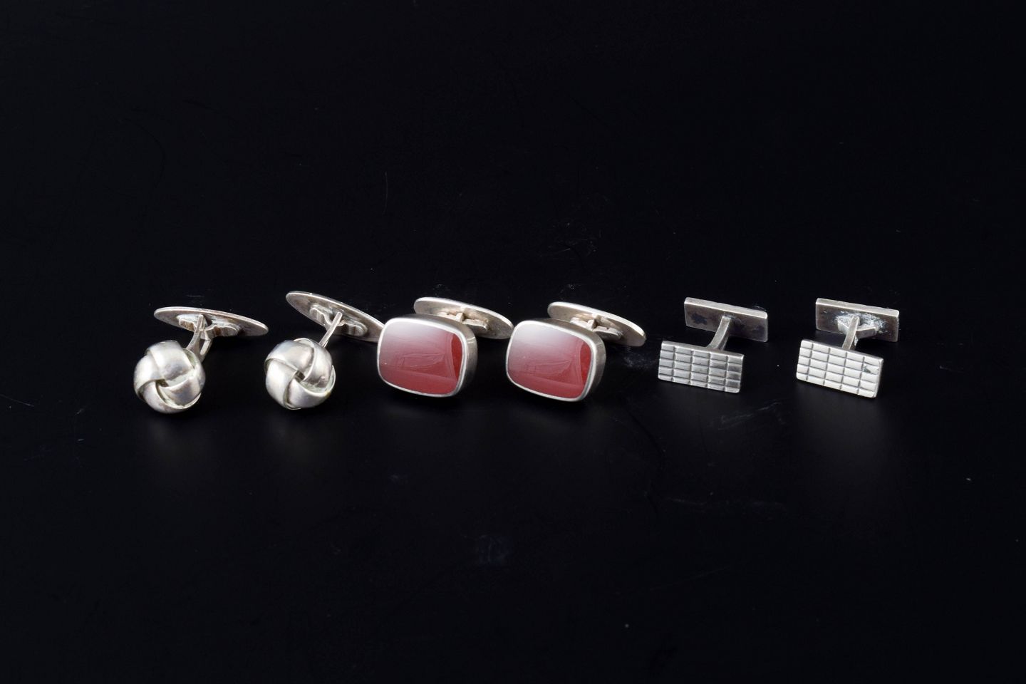 Et elegant sæt af tre forskellige par manchetknapper i sølv, heraf ét par med karneol.