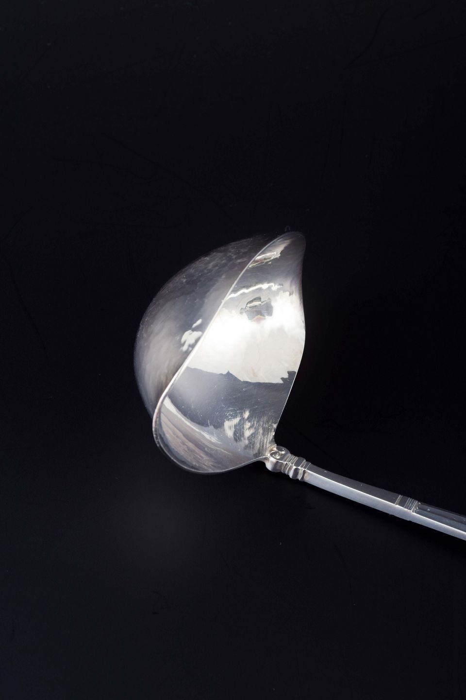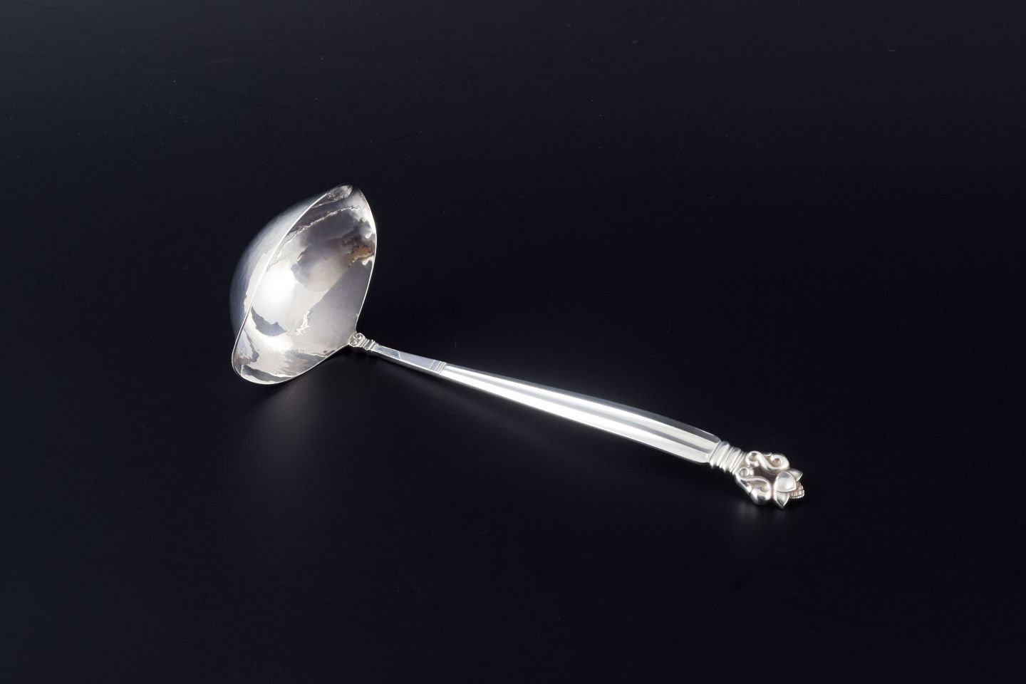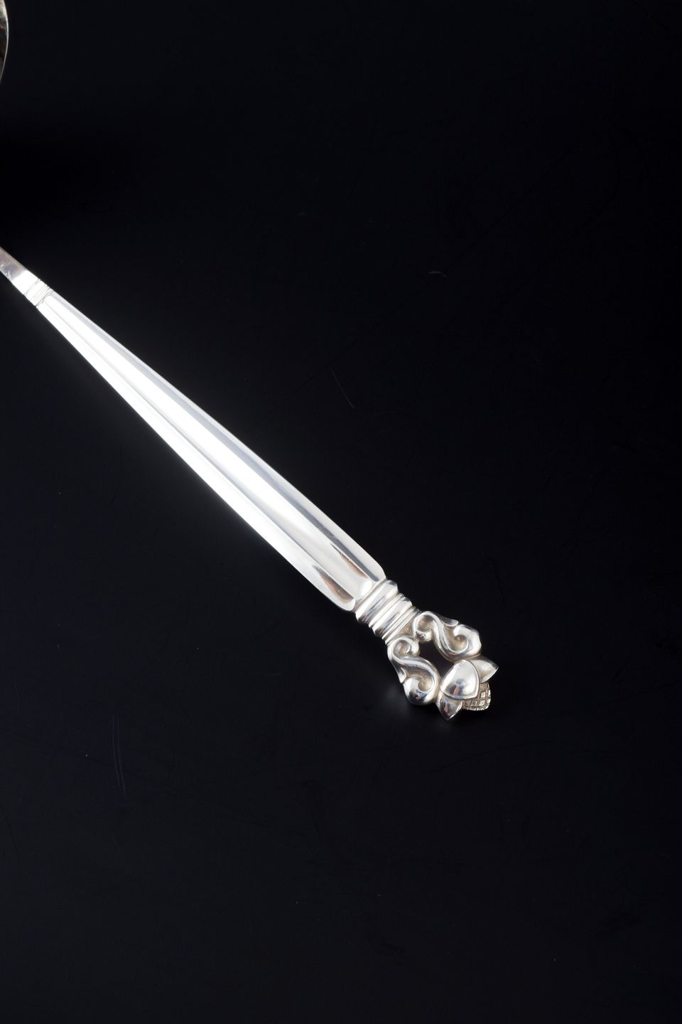 En elegant sauceske fra Georg Jensen i det klassiske “Konge”-mønster, introduceret i 1917 og kendetegnet ved sit dekorative skaft med blomst- og bladmotiv.