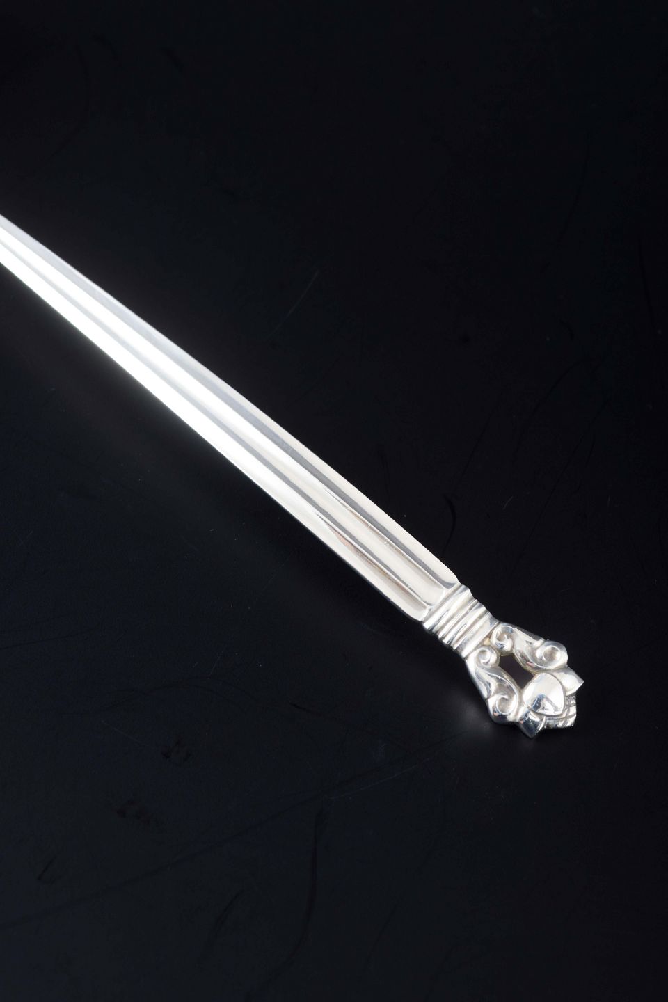 En elegant smørsauceske fra Georg Jensen i det klassiske “Konge”-mønster, introduceret i 1917 og kendetegnet ved sit dekorative skaft med blomst- og bladmotiv.