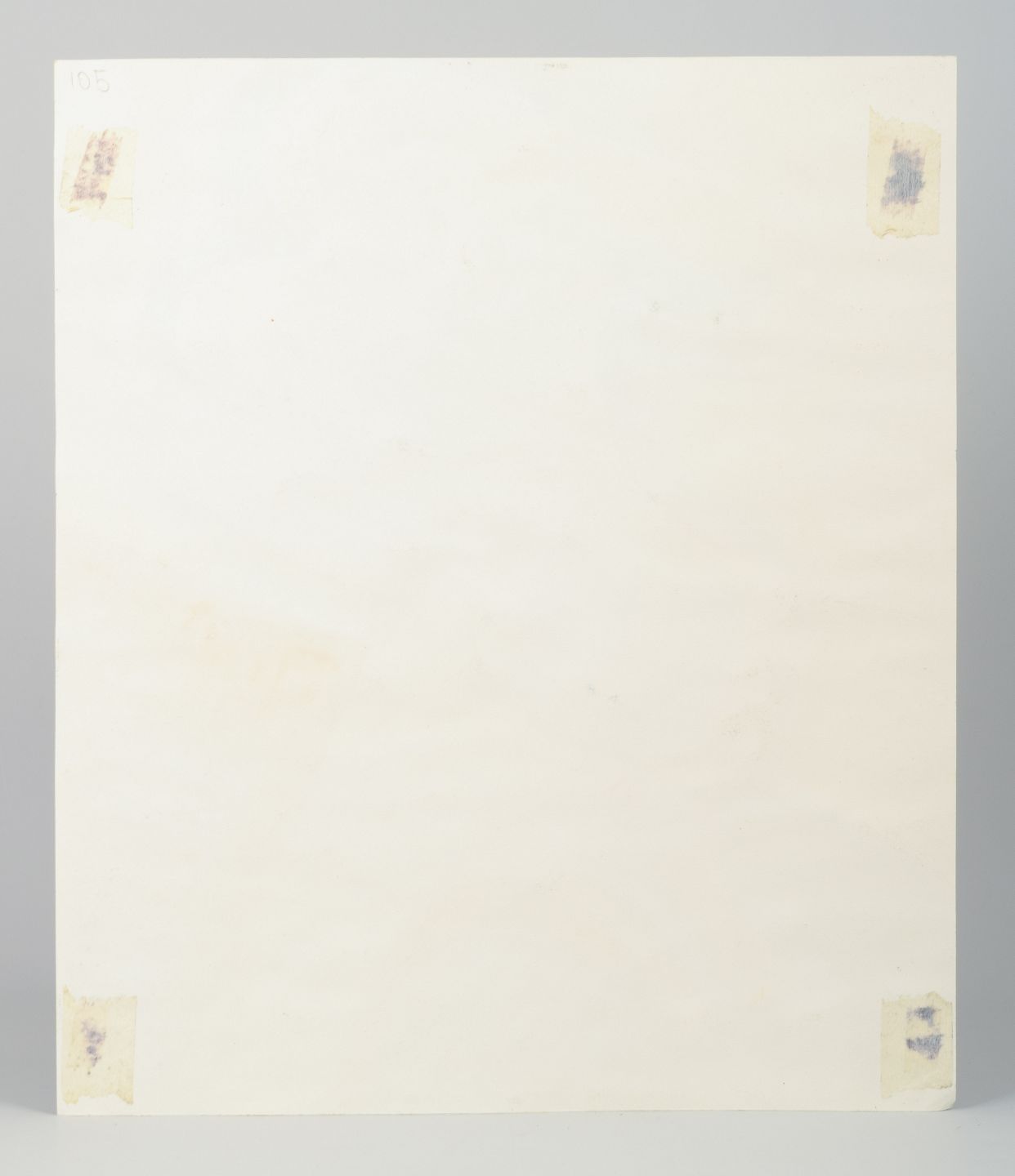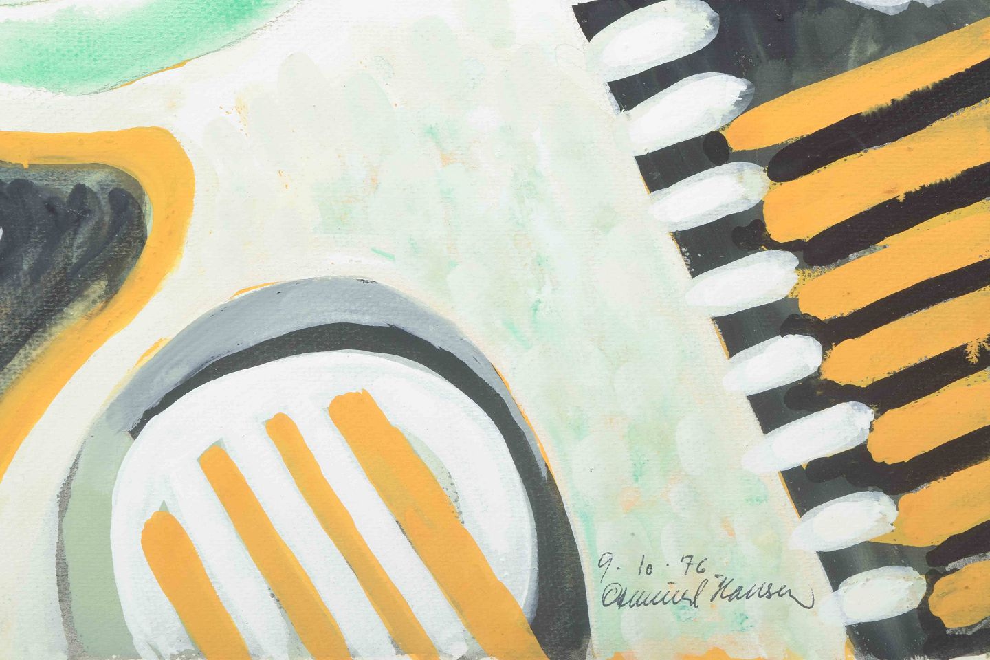 En farverig gouache af Osmund Hansen med dynamiske, organiske former i gule, grønne og sorte nuancer, kombineret med stribede og geometriske elementer. Signeret og dateret 1976.