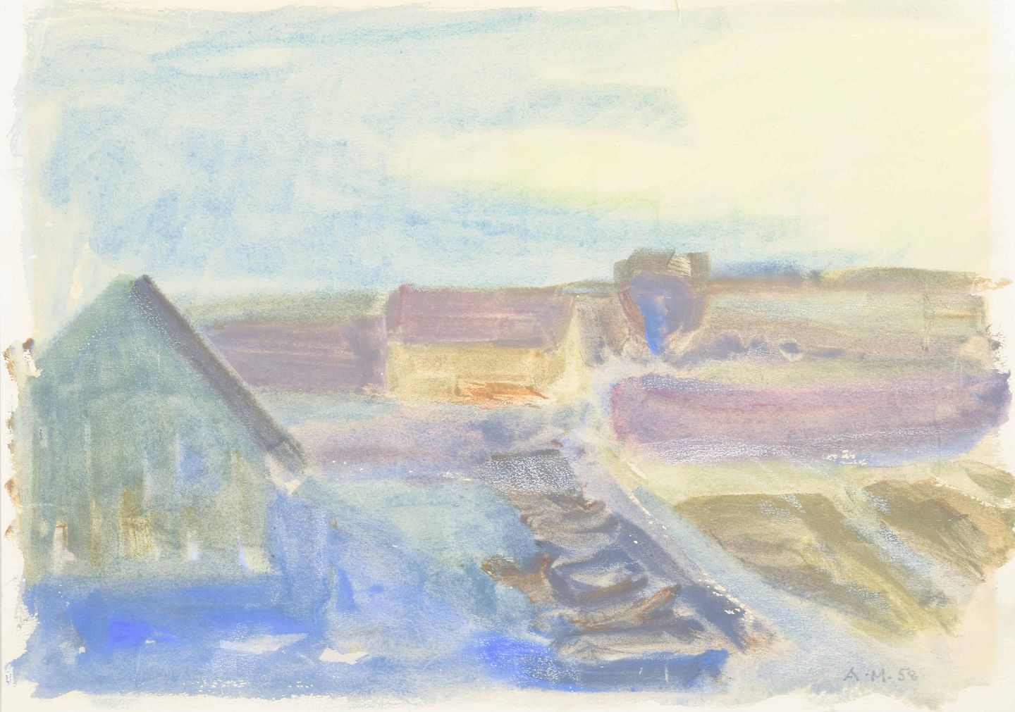 Et stemningsfuldt akvarelmaleri af Aksel Møller fra 1958, der skildrer et kystlandskab med huse, både og brede horisonter. Værket er præget af lette, transparente farvelag i blå og violette toner, der fremhæver en poetisk og impressionistisk stemning.