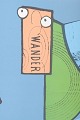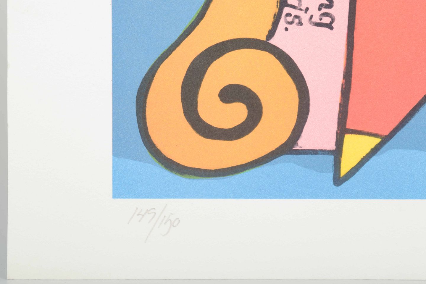 Farvelitografi i klare farver, abstrakt motiv med figurer og tekst.