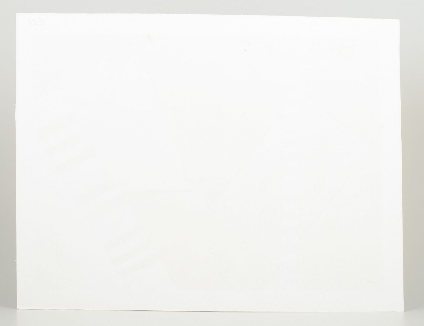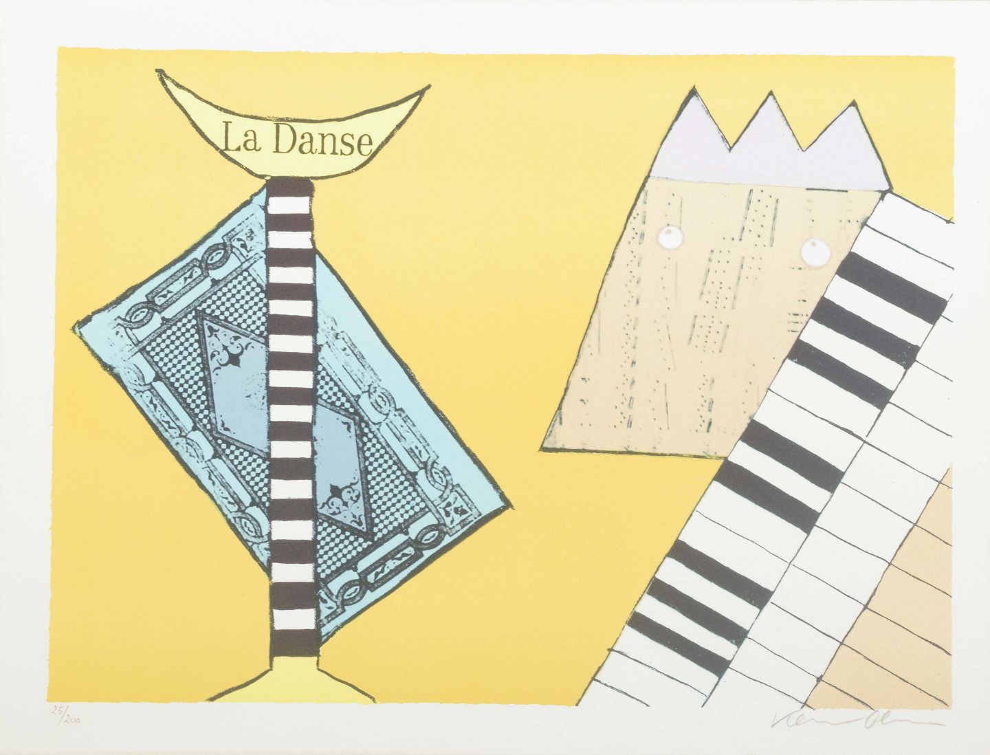 Et dekorativt farvelitografi af den danske kunstner Karin Olesen, præget af hendes karakteristiske legende formsprog og klare farveflader. Motivet kombinerer geometriske elementer, tekstfragmenter og en poetisk, nærmest naivistisk billedverden.