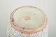 Cylindrisk vase med let udsvajet hals, dekoreret med flerfarvet overglasurmaleri i røde, grønne, blå og sorte nuancer. Motiver af figurscener samt ornamentik langs kant og fod. På skulderen to modellerede løvehanke i gylden glasur.