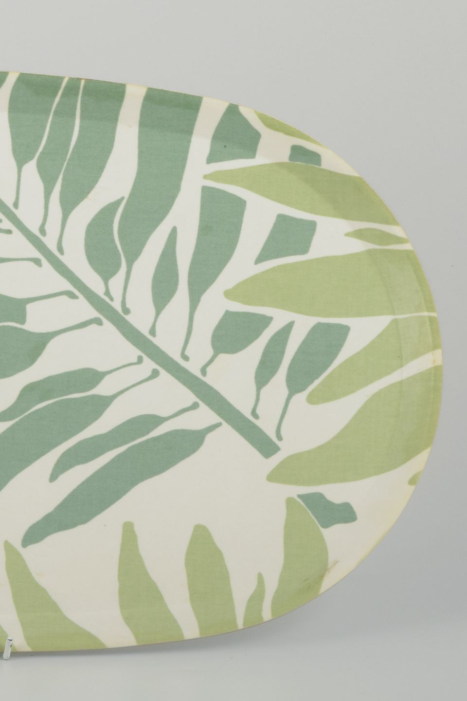 Oval serveringsbakke i formpresset træ med pålimet laminat. Dekoreret med bladmotiv i grønne og lysegrønne nuancer.