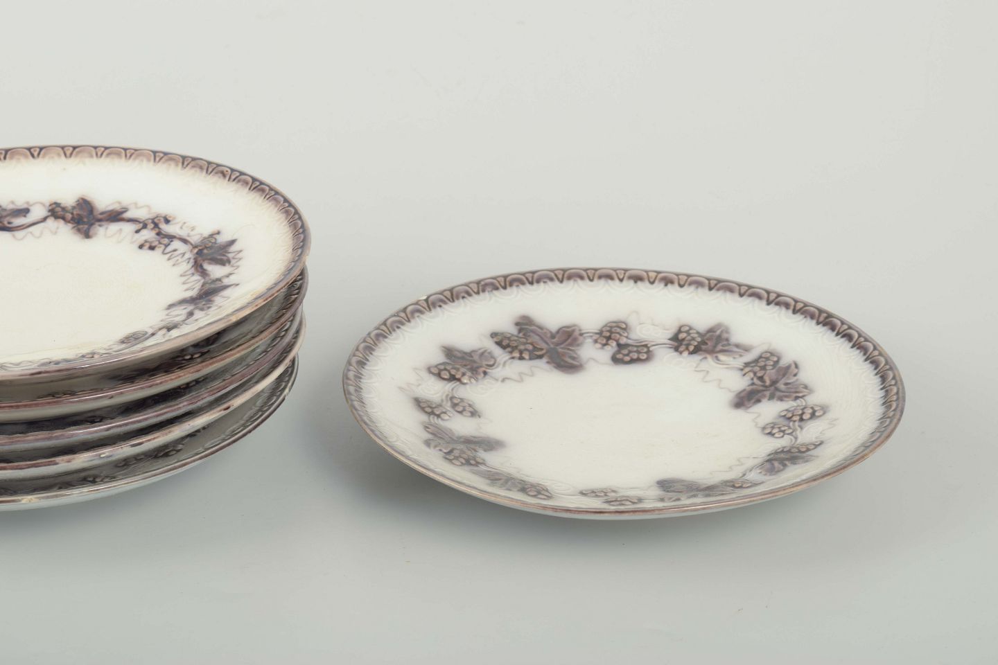 Sæt med 12 runde fajancetallerkener med reliefdekor og vinrankemotiv i brunlig tone langs randen.